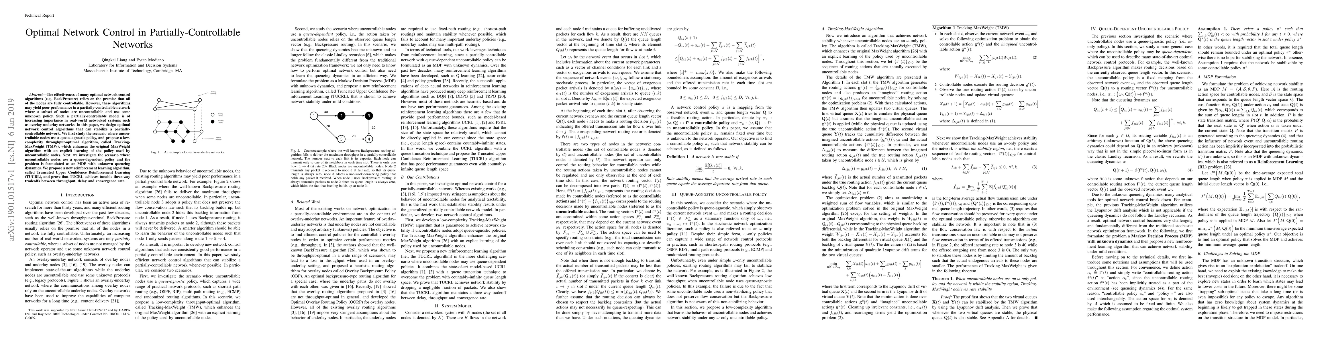 The effectiveness of many optimal network control algorithms (e.g., BackPressure) relies on the premise that all of the nodes are fully controllable. However, these algorithms may yield poor performance in a partially-controllable network where a subset of nodes are uncontrollable and use some unknown policy. Such a partially-controllable model is of increasing importance in real-world networked systems such as overlay-underlay networks. In this paper, we design optimal network control algorithms that can stabilize a partially-controllable network. We first study the scenario where uncontrollable nodes use a queue-agnostic policy, and propose a low-complexity throughput-optimal algorithm, called Tracking-MaxWeight (TMW), which enhances the original MaxWeight algorithm with an explicit learning of the policy used by uncontrollable nodes. Next, we investigate the scenario where uncontrollable nodes use a queue-dependent policy and the problem is formulated as an MDP with unknown queueing dynamics. We propose a new reinforcement learning algorithm, called Truncated Upper Confidence Reinforcement Learning (TUCRL), and prove that TUCRL achieves tunable three-way tradeoffs between throughput, delay and convergence rate.