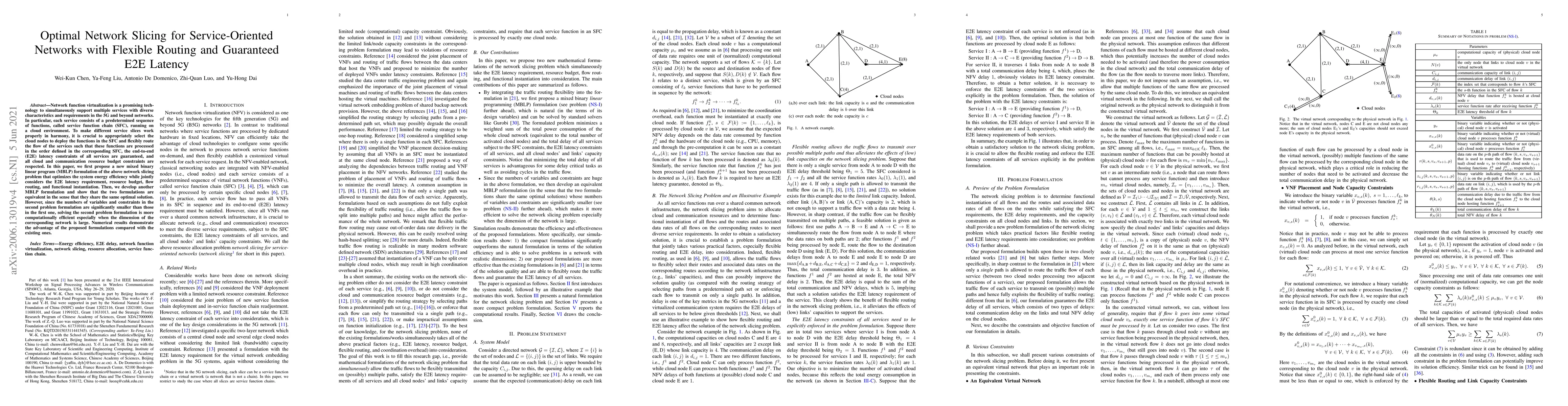 Network function virtualization is a promising technology to simultaneously support multiple services with diverse characteristics and requirements in the 5G and beyond networks. In particular, each service consists of a predetermined sequence of functions, called service function chain (SFC), running on a cloud environment. To make different service slices work properly in harmony, it is crucial to appropriately select the cloud nodes to deploy the functions in the SFC and flexibly route the flow of the services such that these functions are processed in the order defined in the corresponding SFC, the end-to-end (E2E) latency constraints of all services are guaranteed, and all cloud and communication resource budget constraints are respected. In this paper, we first propose a new mixed binary linear program (MBLP) formulation of the above network slicing problem that optimizes the system energy efficiency while jointly considers the E2E latency requirement, resource budget, flow routing, and functional instantiation. Then, we develop another MBLP formulation and show that the two formulations are equivalent in the sense that they share the same optimal solution. However, since the numbers of variables and constraints in the second problem formulation are significantly smaller than those in the first one, solving the second problem formulation is more computationally efficient especially when the dimension of the corresponding network is large. Numerical results demonstrate the advantage of the proposed formulations compared with the existing ones.