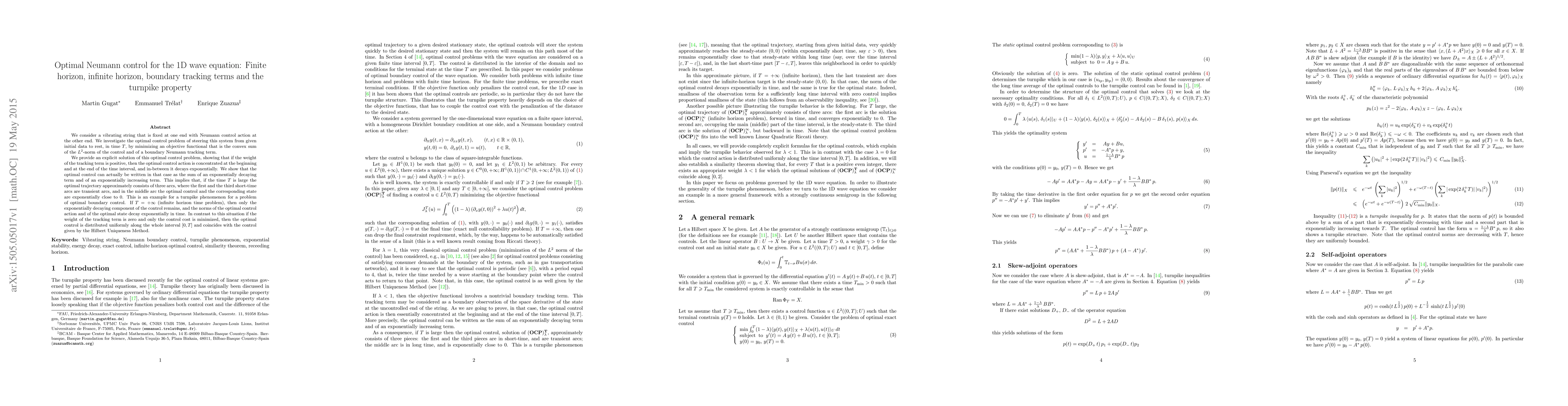 This paper studies optimal Neumann control for a 1D wave equation, focusing on steering a vibrating string to rest by minimizing a control cost and a boundary tracking term. It reveals a turnpike property where, for large time horizons, the optimal control exhibits transient arcs at the beginning and end, with an exponentially decaying middle arc. For infinite horizons, only the decaying component remains, contrasting with uniform control distribution when only the control cost is minimized.