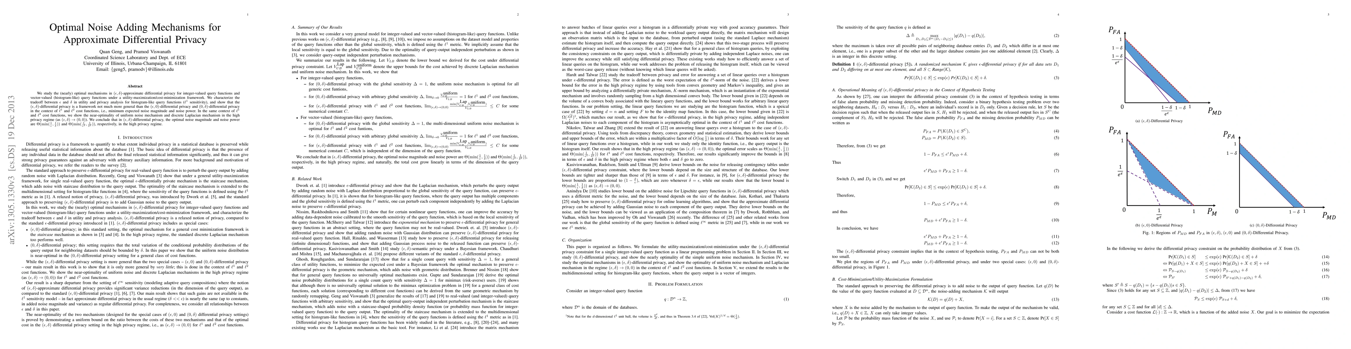 This paper investigates optimal noise addition mechanisms for $(\epsilon,\delta)$-approximate differential privacy, focusing on integer and histogram-like query functions. It demonstrates that $(\epsilon,\delta)$-differential privacy is nearly equivalent to $(\epsilon,0)$- or $(0,\delta)$-privacy in terms of noise optimization, and confirms the near-optimality of uniform and discrete Laplacian noise mechanisms in high privacy settings.