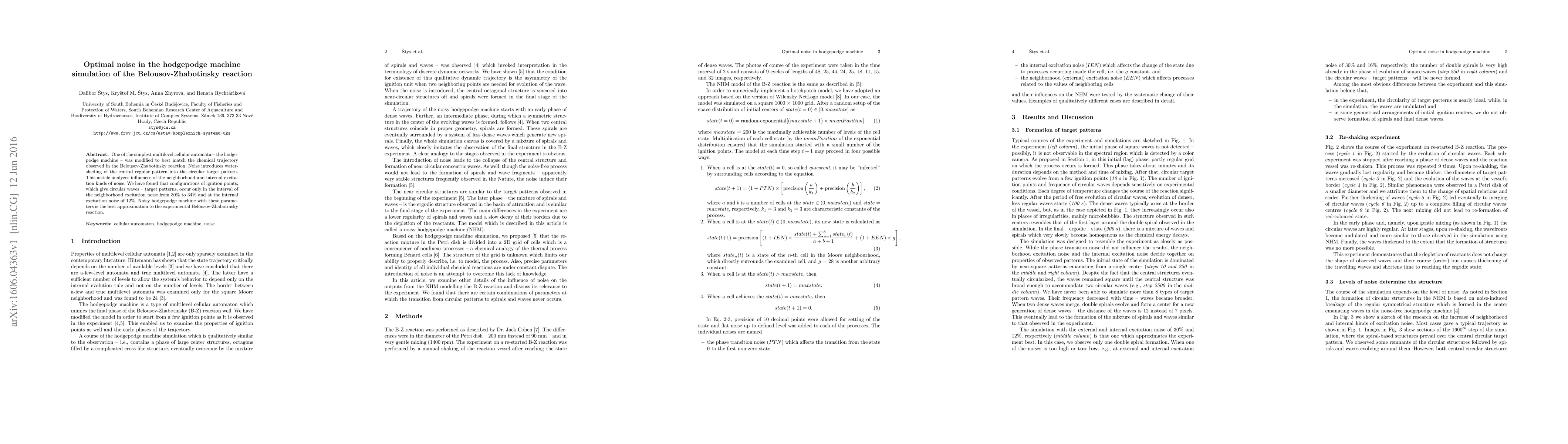 Researchers optimized a cellular automata model to match the Belousov-Zhabotinsky reaction by introducing noise, finding that specific levels of neighborhood and internal excitation noise create circular waves in the target pattern.