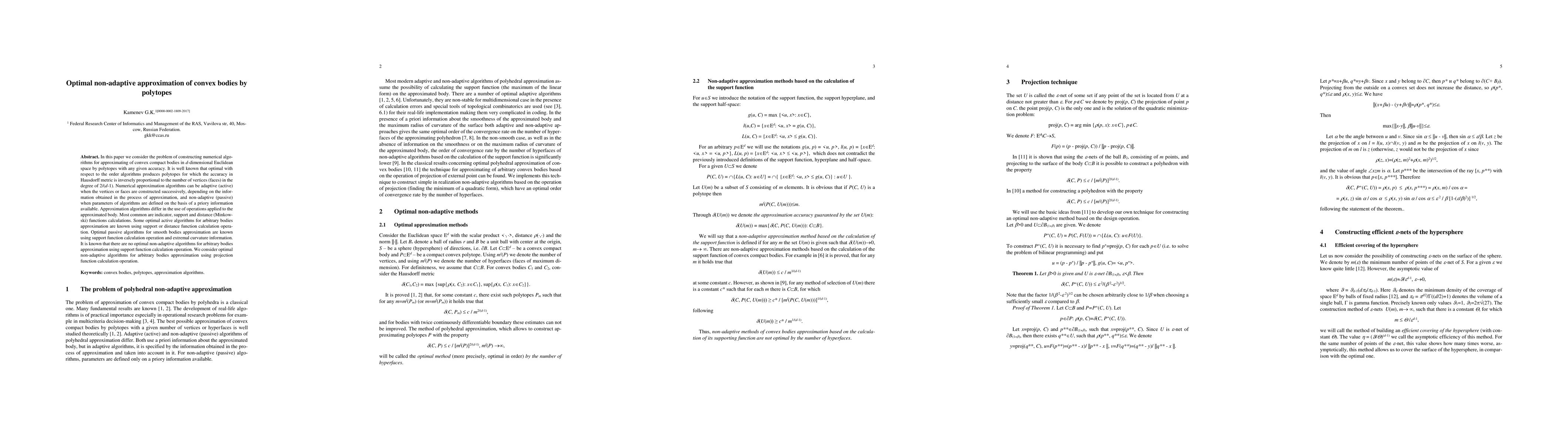 This paper investigates optimal non-adaptive algorithms for approximating convex compact bodies in d-dimensional space by polytopes, focusing on the use of projection function calculations to achieve accuracy inversely proportional to the number of vertices raised to the degree of 2/(d-1). Traditional adaptive methods exist, but this study specifically seeks non-adaptive solutions for arbitrary body approximations.