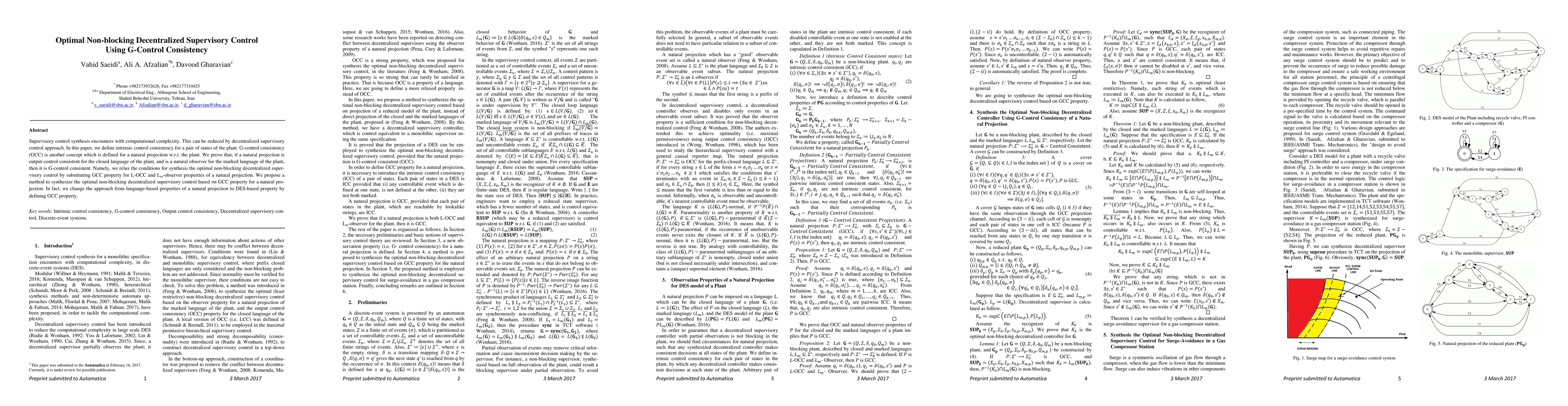 Supervisory control synthesis encounters with computational complexity. This can be reduced by decentralized supervisory control approach. In this paper, we define intrinsic control consistency for a pair of states of the plant. G-control consistency (GCC) is another concept which is defined for a natural projection w.r.t. the plant. We prove that, if a natural projection is output control consistent for the closed language of the plant, and is a natural observer for the marked language of the plant, then it is G-control consistent. Namely, we relax the conditions for synthesis the optimal non-blocking decentralized supervisory control by substituting GCC property for L-OCC and Lm-observer properties of a natural projection. We propose a method to synthesize the optimal non-blocking decentralized supervisory control based on GCC property for a natural projection. In fact, we change the approach from language-based properties of a natural projection to DES-based property by defining GCC property.