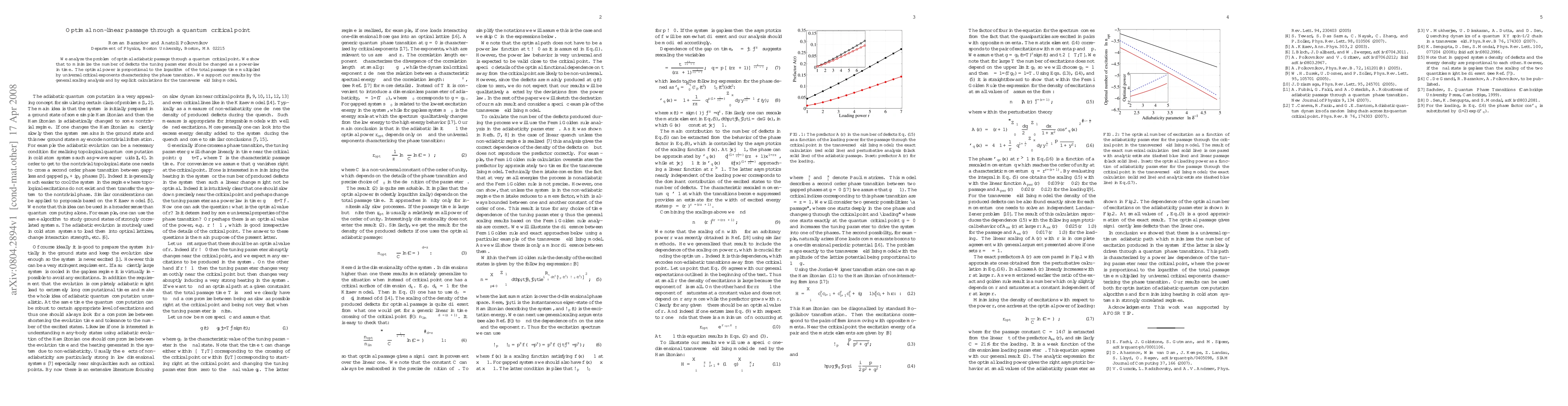 This paper investigates the optimal adiabatic passage through a quantum critical point, demonstrating that a power-law change in the tuning parameter minimizes defects. The optimal power-law exponent is shown to be proportional to the logarithm of the passage time, scaled by universal critical exponents.