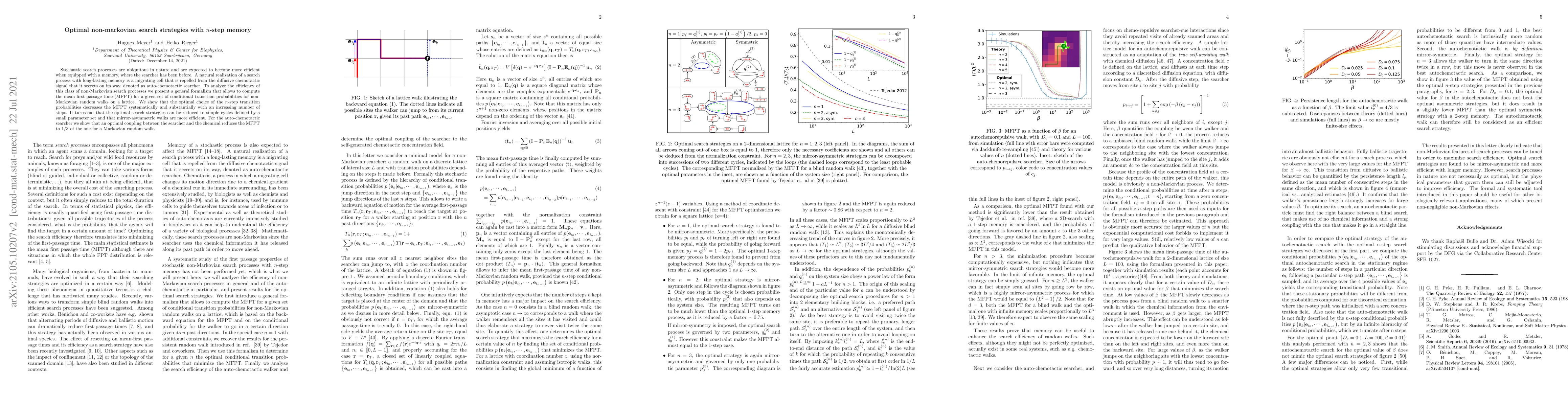 Stochastic search processes are ubiquitous in nature and are expected to become more efficient when equipped with a memory, where the searcher has been before. A natural realization of a search process with long-lasting memory is a migrating cell that is repelled from the diffusive chemotactic signal that it secrets on its way, denoted as auto-chemotactic searcher. To analyze the efficiency of this class of non-Markovian search processes we present a general formalism that allows to compute the mean first passage time (MFPT) for a given set of conditional transition probabilities for non-Markovian random walks on a lattice. We show that the optimal choice of the $n$-step transition probabilities decreases the MFPT systematically and substantially with an increasing number of steps. It turns out that the optimal search strategies can be reduced to simple cycles defined by a small parameter set and that mirror-asymmetric walks are more efficient. For the auto-chemotactic searcher we show that an optimal coupling between the searcher and the chemical reduces the MFPT to 1/3 of the one for a Markovian random walk.