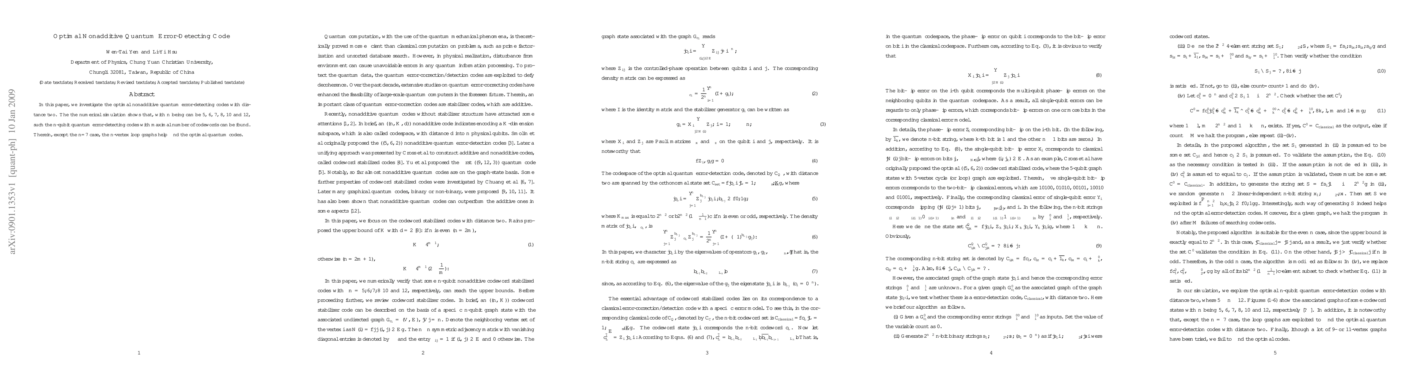 This paper explores the optimal nonadditive quantum error-detecting codes with distance two, demonstrating that maximal n-qubit codes can be found for n values of 5, 6, 8, 10, and 12 using n-vertex loop graphs, except for n=7.