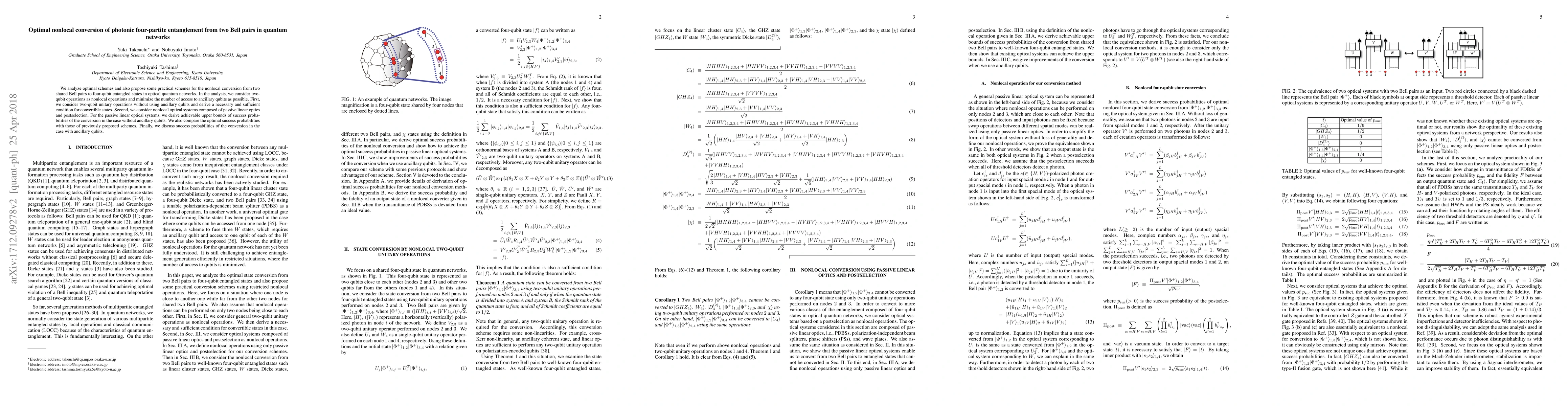 We analyze optimal schemes and also propose some practical schemes for the nonlocal conversion from two shared Bell pairs to four-qubit entangled states in optical quantum networks. In the analysis, we consider two-qubit operations as nonlocal operations and minimize the number of access to ancillary qubits as possible. First, we consider two-qubit unitary operations without using ancillary qubits and derive a necessary and sufficient condition for convertible states. Second, we consider nonlocal optical systems composed of passive linear optics and postselection. For the passive linear optical systems, we derive achievable upper bounds of success probabilities of the conversion in the case without ancillary qubits. We also compare the optimal success probabilities with those of previously proposed schemes. Finally, we discuss success probabilities of the conversion in the case with ancillary qubits.