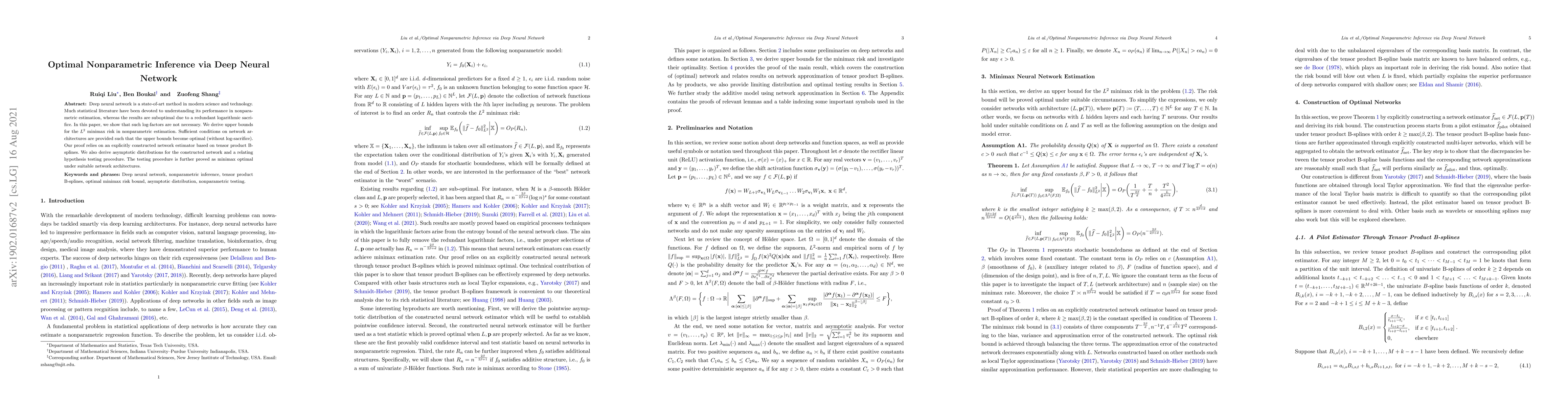 This paper demonstrates that deep neural networks can achieve optimal nonparametric inference without the traditional log-factors that previously limited performance. It proposes a network architecture based on tensor product B-splines, deriving optimal upper bounds for $L^2$ minimax risk and proving the asymptotic distribution and minimax optimality of the proposed network estimator and hypothesis testing procedure.