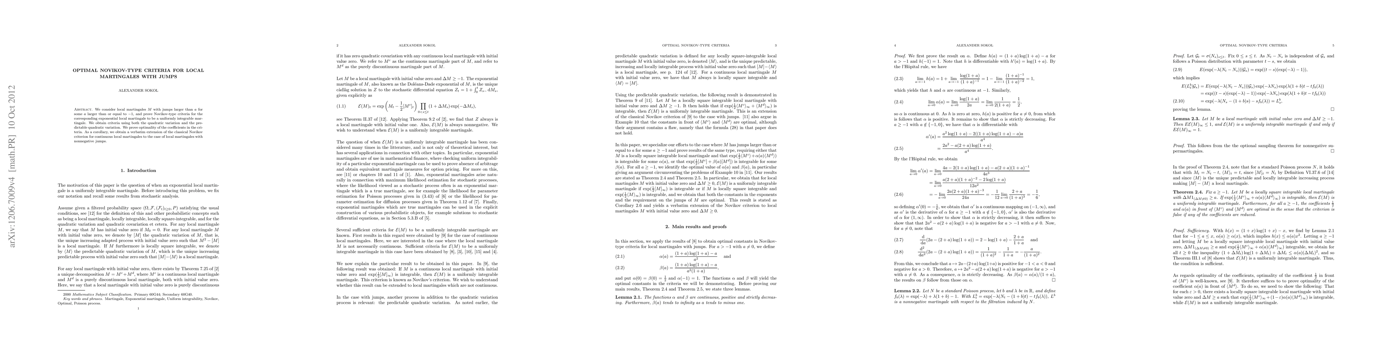 This paper establishes optimal Novikov-type criteria for local martingales with jumps exceeding a certain threshold, ensuring the corresponding exponential local martingales are uniformly integrable. The criteria are derived using both quadratic and predictable quadratic variations, with proven optimality of the coefficients involved.