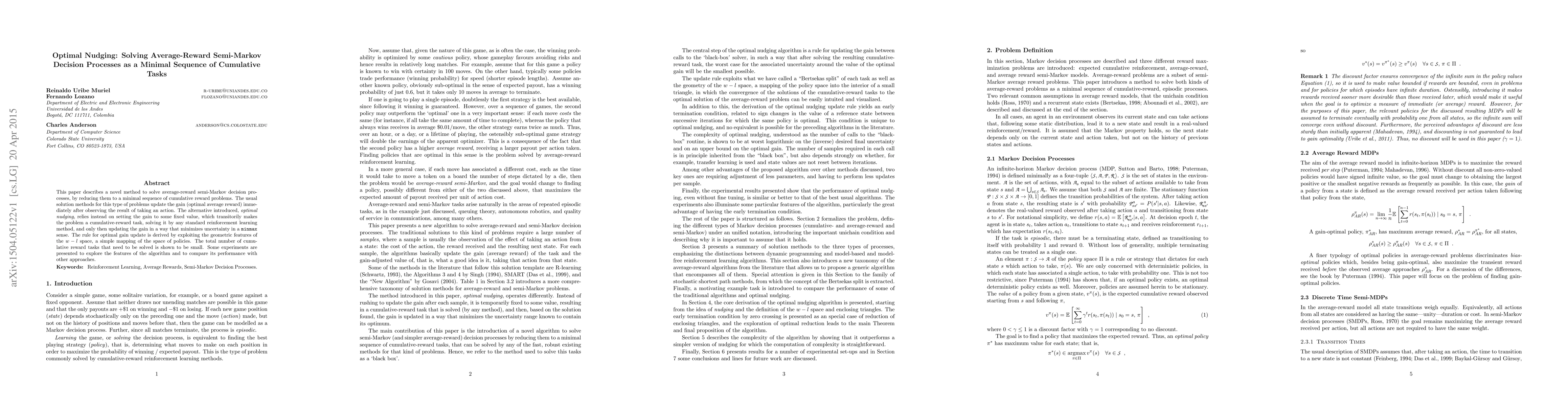 This paper proposes "optimal nudging," a novel method for solving average-reward semi-Markov decision processes by transforming them into a minimal sequence of cumulative reward problems, using a derived rule for gain update to minimize uncertainty. Experiments show its performance compared to other methods.