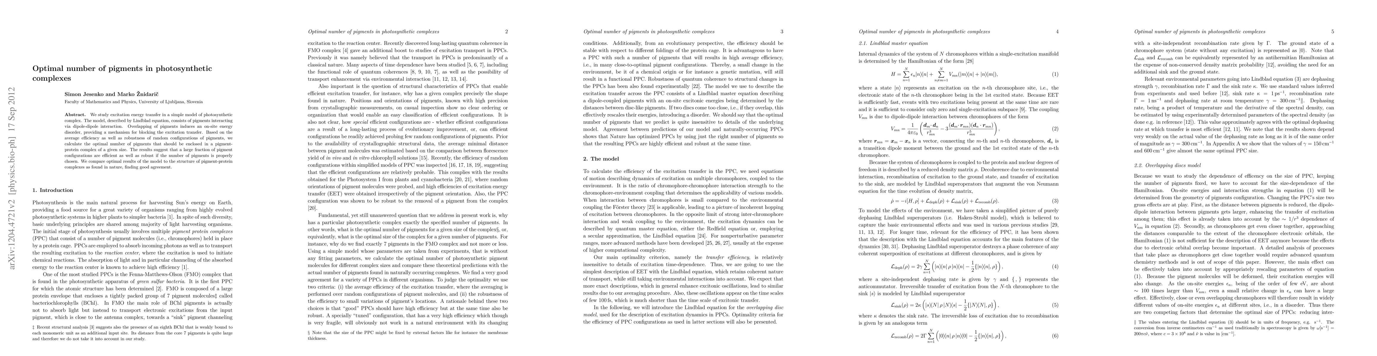 We study excitation energy transfer in a simple model of photosynthetic complex. The model, described by Lindblad equation, consists of pigments interacting via dipole-dipole interaction. Overlapping of pigments induces an on-site energy disorder, providing a mechanism for blocking the excitation transfer. Based on the average efficiency as well as robustness of random configurations of pigments, we calculate the optimal number of pigments that should be enclosed in a pigment-protein complex of a given size. The results suggest that a large fraction of pigment configurations are efficient as well as robust if the number of pigments is properly chosen. We compare optimal results of the model to the structure of pigment-protein complexes as found in nature, finding good agreement.
