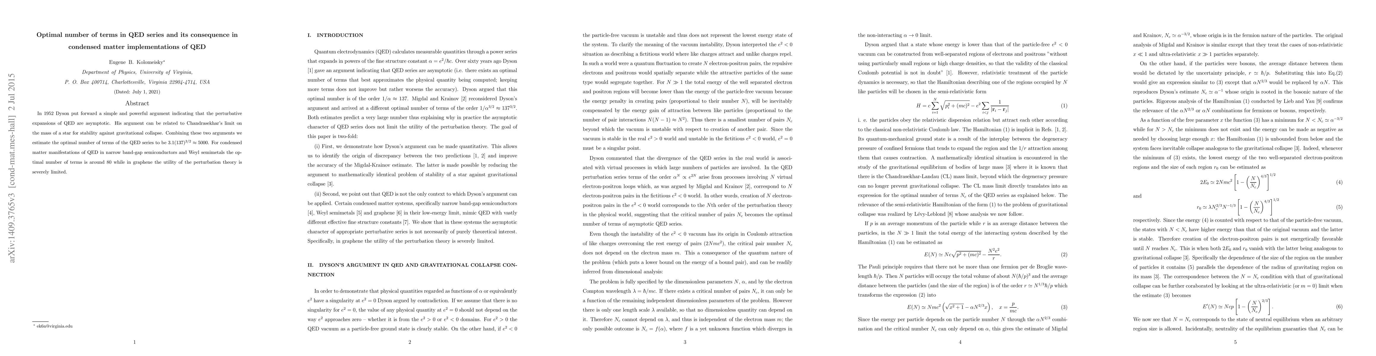 In 1952 Dyson put forward a simple and powerful argument indicating that the perturbative expansions of QED are asymptotic. His argument can be related to Chandrasekhar's limit on the mass of a star for stability against gravitational collapse. Combining these two arguments we estimate the optimal number of terms of the QED series to be $3.1(137)^{3/2}\approx5000$. For condensed matter manifestations of QED in narrow band-gap semiconductors and Weyl semimetals the optimal number of terms is around $80$ while in graphene the utility of the perturbation theory is severely limited.