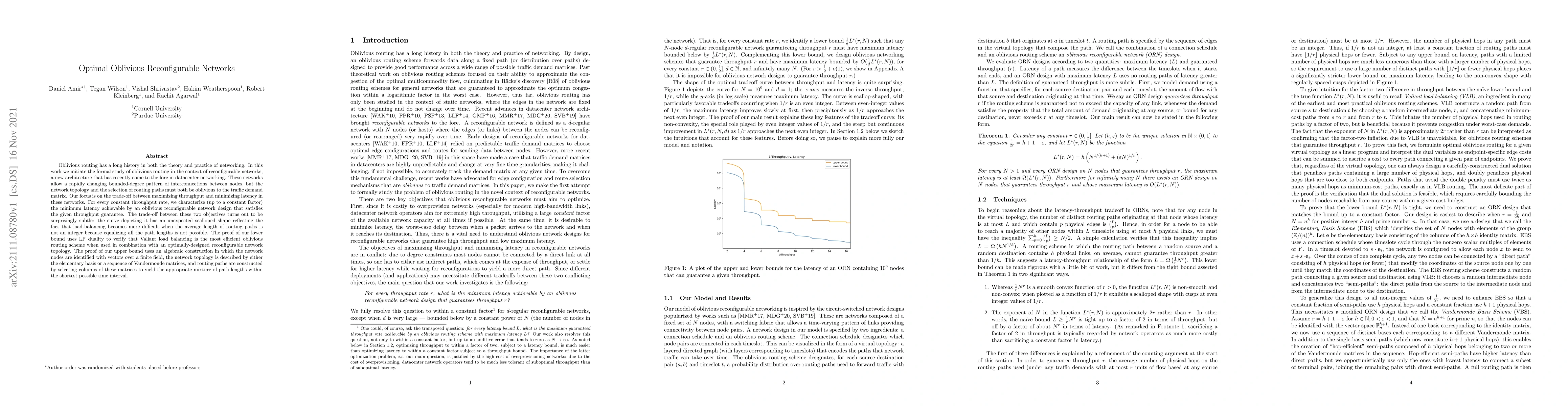 This research paper introduces the study of oblivious routing in reconfigurable networks, a new datacenter networking architecture. It characterizes the trade-off between maximizing throughput and minimizing latency, revealing a scalloped curve due to non-integer average path lengths. The proof utilizes LP duality and an algebraic construction involving finite fields and Vandermonde matrices to demonstrate that Valiant load balancing is optimal for oblivious routing in these networks.