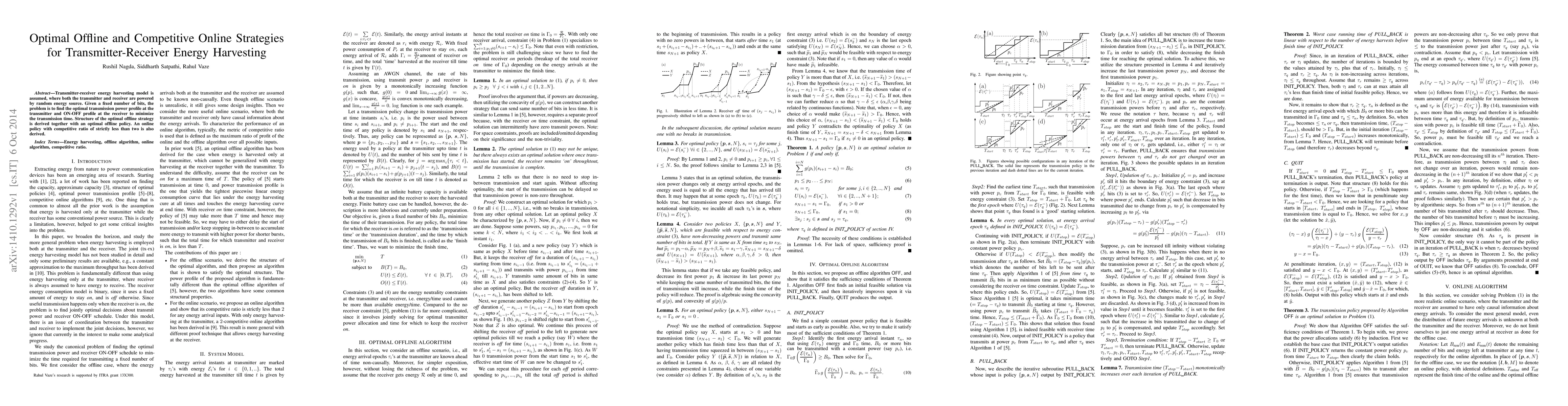 This paper investigates optimal strategies for a transmitter-receiver energy harvesting model, deriving an optimal offline strategy and policy to minimize transmission time. It also presents an online policy with a competitive ratio of strictly less than two.