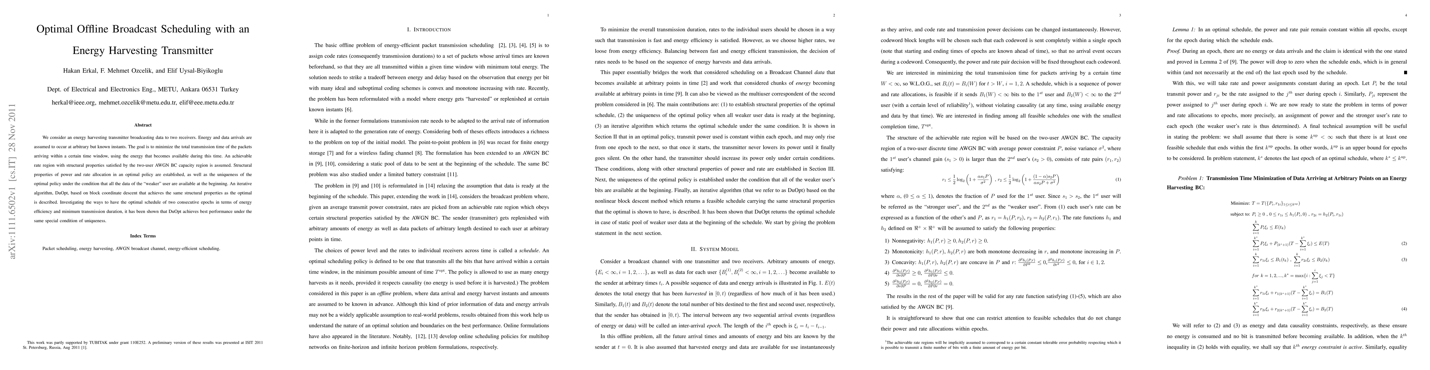 Researchers developed an algorithm to optimize offline broadcast scheduling for energy harvesting transmitters, minimizing transmission time while maximizing efficiency. Their DuOpt algorithm achieves optimal performance under specific conditions, outperforming other methods in terms of energy efficiency and minimum transmission duration.