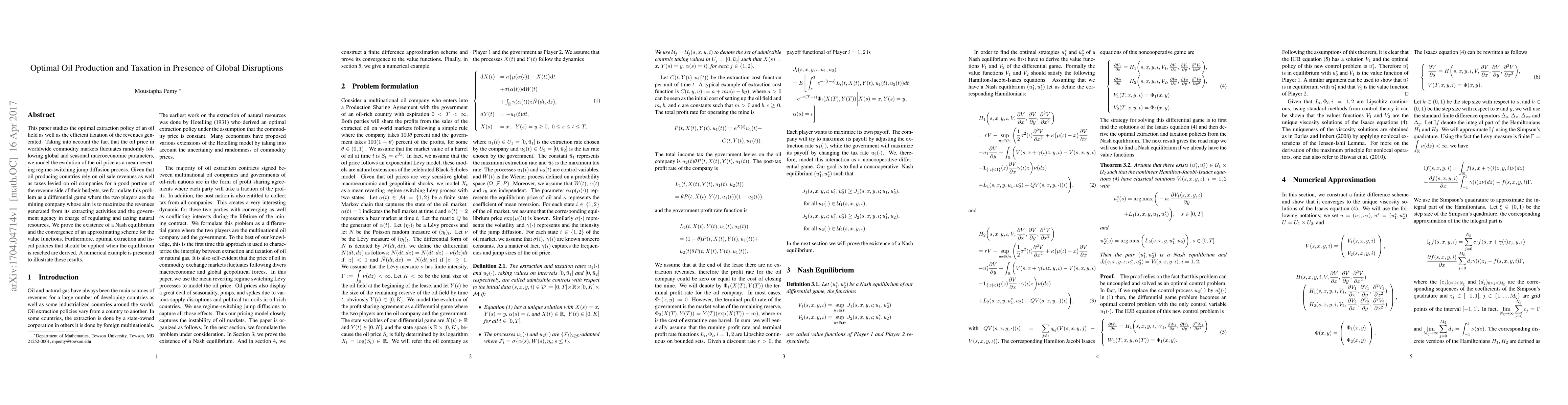 This paper studies the optimal extraction policy of an oil field as well as the efficient taxation of the revenues generated. Taking into account the fact that the oil price in worldwide commodity markets fluctuates randomly following global and seasonal macroeconomic parameters, we model the evolution of the oil price as a mean reverting regime-switching jump diffusion process. Given that oil producing countries rely on oil sale revenues as well as taxes levied on oil companies for a good portion of the revenue side of their budgets, we formulate this problem as a differential game where the two players are the mining company whose aim is to maximize the revenues generated from its extracting activities and the government agency in charge of regulating and taxing natural resources. We prove the existence of a Nash equilibrium and the convergence of an approximating scheme for the value functions. Furthermore, optimal extraction and fiscal policies that should be applied when the equilibrium is reached are derived.A numerical example is presented to illustrate these results.