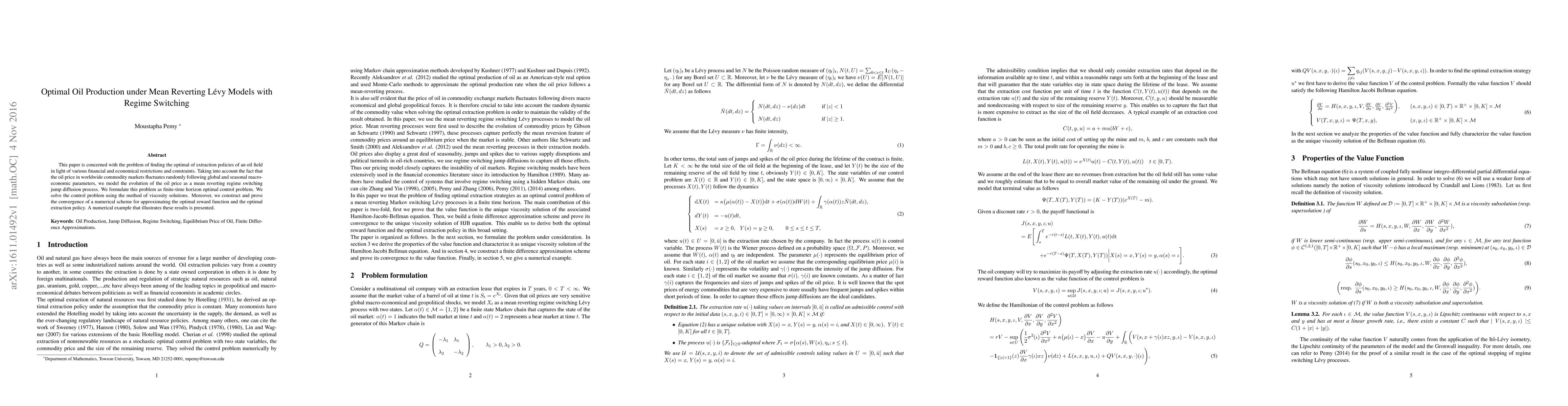 This paper develops an optimal extraction policy for oil fields under mean reverting Lévy models with regime switching, addressing financial and economic constraints. It employs viscosity solutions and a numerical scheme to approximate the optimal reward function and extraction policy, validated by a numerical example.
