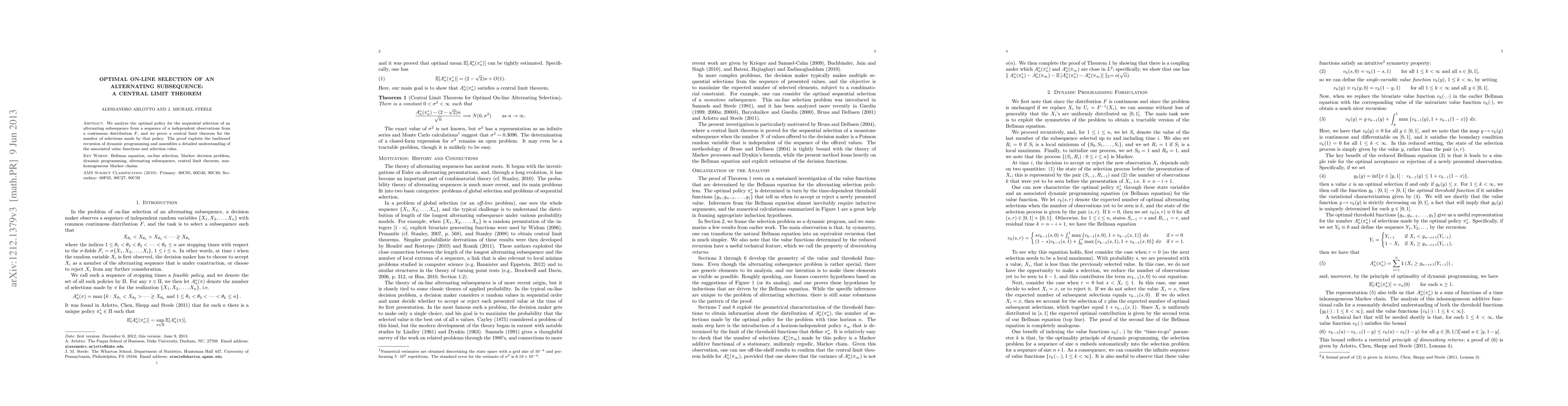 We analyze the optimal policy for the sequential selection of an alternating subsequence from a sequence of $n$ independent observations from a continuous distribution $F$, and we prove a central limit theorem for the number of selections made by that policy. The proof exploits the backward recursion of dynamic programming and assembles a detailed understanding of the associated value functions and selection rules.