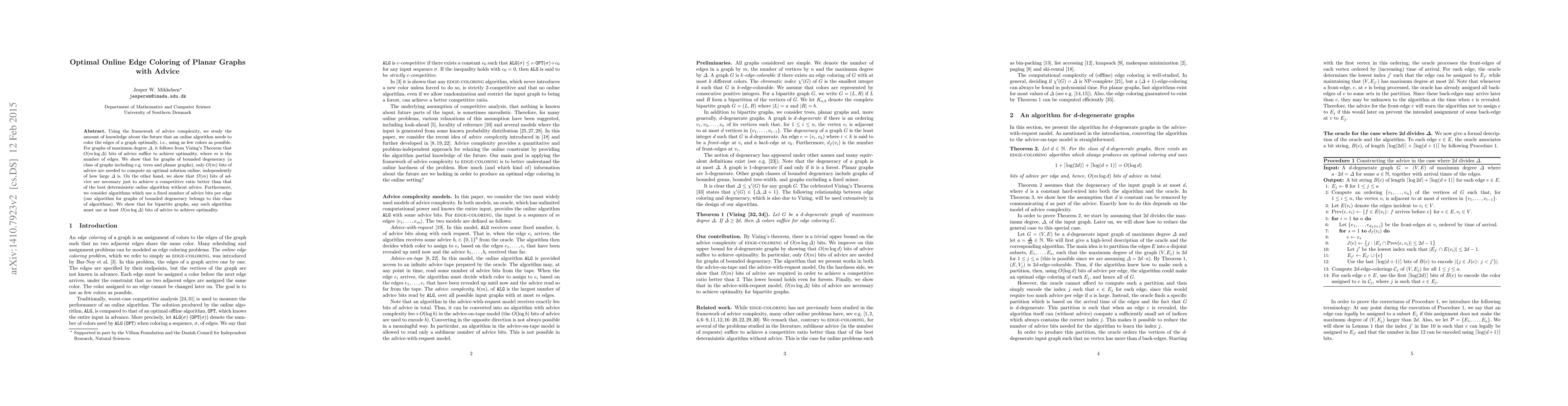 Using the framework of advice complexity, we study the amount of knowledge about the future that an online algorithm needs to color the edges of a graph optimally, i.e., using as few colors as possible. For graphs of maximum degree $\Delta$, it follows from Vizing's Theorem that $O(m\log \Delta)$ bits of advice suffice to achieve optimality, where $m$ is the number of edges. We show that for graphs of bounded degeneracy (a class of graphs including e.g. trees and planar graphs), only $O(m)$ bits of advice are needed to compute an optimal solution online, independently of how large $\Delta$ is. On the other hand, we show that $\Omega (m)$ bits of advice are necessary just to achieve a competitive ratio better than that of the best deterministic online algorithm without advice. Furthermore, we consider algorithms which use a fixed number of advice bits per edge (our algorithm for graphs of bounded degeneracy belongs to this class of algorithms). We show that for bipartite graphs, any such algorithm must use at least $\Omega(m\log \Delta)$ bits of advice to achieve optimality.