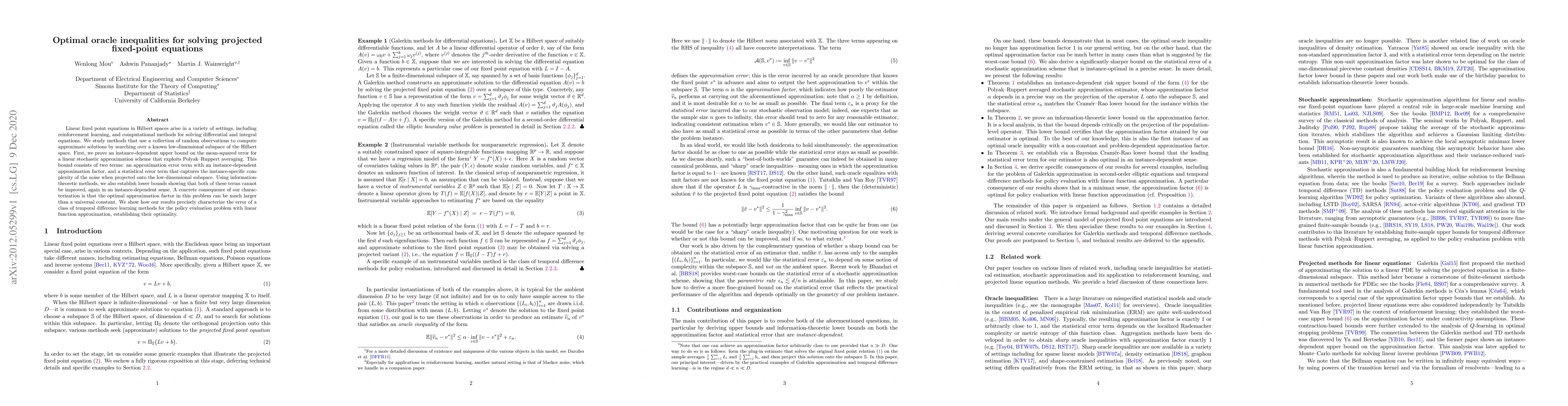 Linear fixed point equations in Hilbert spaces arise in a variety of settings, including reinforcement learning, and computational methods for solving differential and integral equations. We study methods that use a collection of random observations to compute approximate solutions by searching over a known low-dimensional subspace of the Hilbert space. First, we prove an instance-dependent upper bound on the mean-squared error for a linear stochastic approximation scheme that exploits Polyak--Ruppert averaging. This bound consists of two terms: an approximation error term with an instance-dependent approximation factor, and a statistical error term that captures the instance-specific complexity of the noise when projected onto the low-dimensional subspace. Using information theoretic methods, we also establish lower bounds showing that both of these terms cannot be improved, again in an instance-dependent sense. A concrete consequence of our characterization is that the optimal approximation factor in this problem can be much larger than a universal constant. We show how our results precisely characterize the error of a class of temporal difference learning methods for the policy evaluation problem with linear function approximation, establishing their optimality.