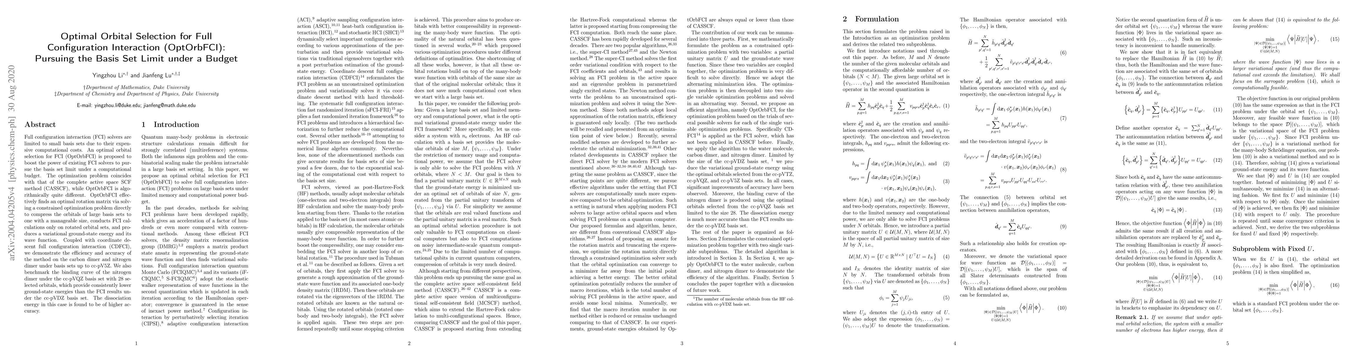The OptOrbFCI method optimizes orbital selection to extend the applicability of full configuration interaction (FCI) solvers to larger basis sets by compressing orbitals within a computational budget, achieving more accurate ground-state energies compared to smaller basis sets. Benchmarked on carbon and nitrogen dimers, it demonstrates enhanced efficiency and accuracy.