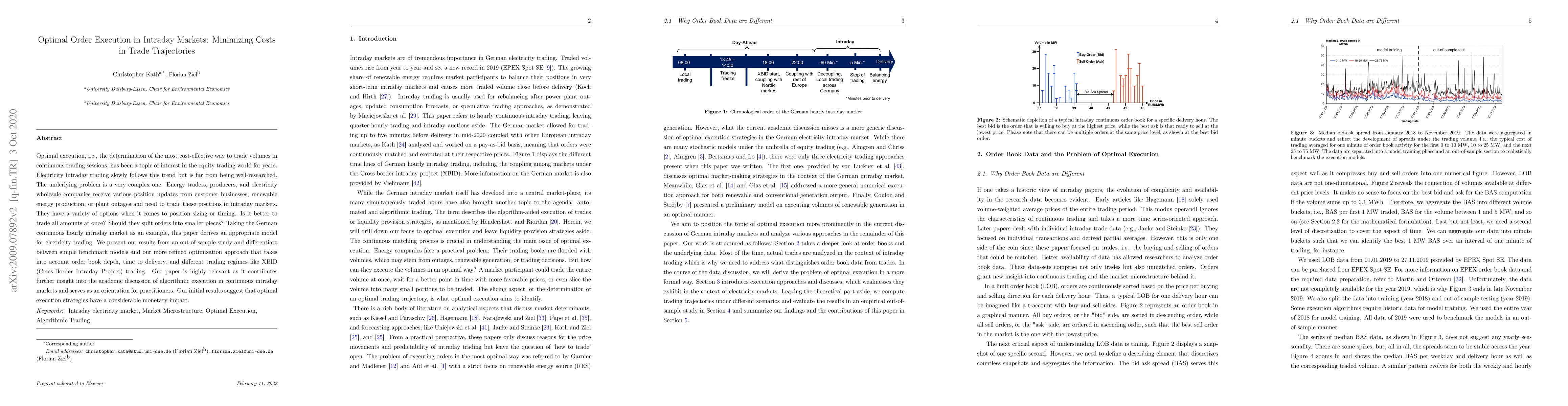 This paper develops an optimal order execution model for electricity trading in intraday markets, focusing on minimizing trading costs. It compares simple benchmark models with a refined optimization approach considering order book depth and trading regimes, showing significant monetary benefits for the latter.