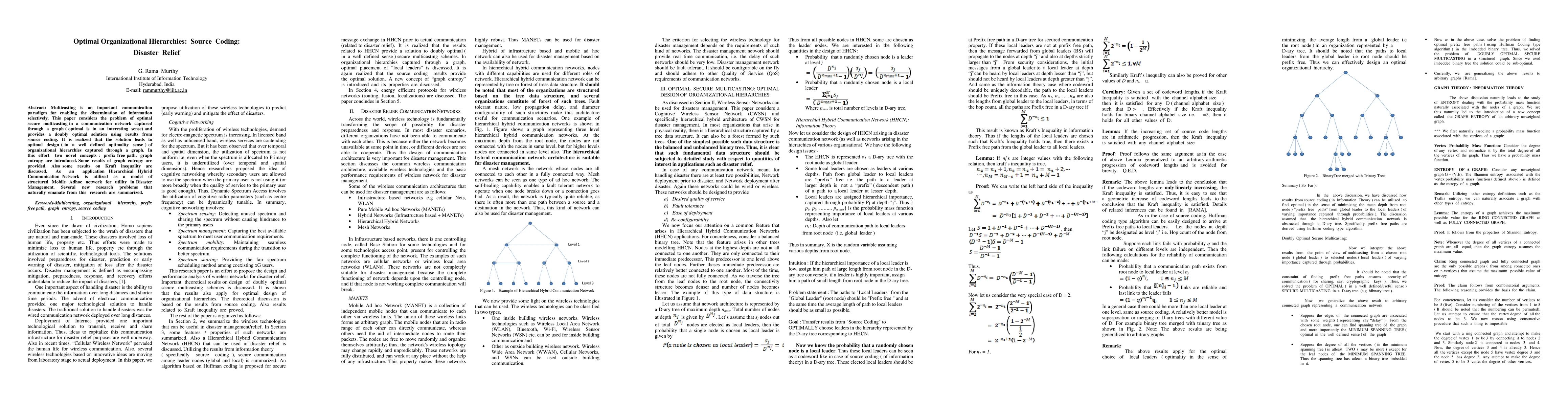 This paper develops a new approach to designing organizational hierarchies for disaster relief using source coding principles, introducing key concepts like graph entropy and prefix-free paths. It provides a doubly optimal solution for secure multicasting in communication networks.