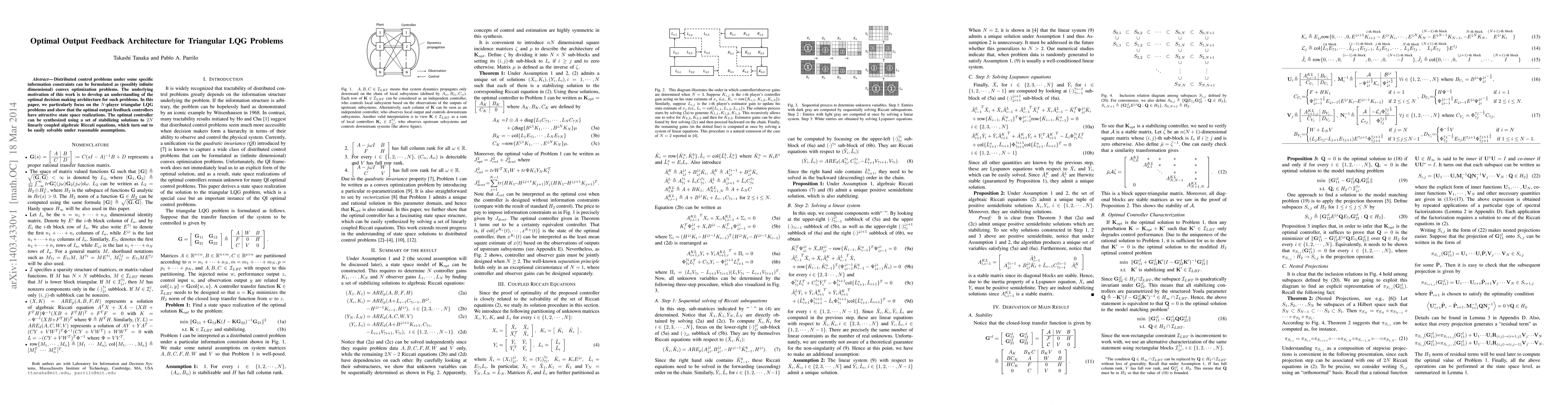 Distributed control problems under some specific information constraints can be formulated as (possibly infinite dimensional) convex optimization problems. The underlying motivation of this work is to develop an understanding of the optimal decision making architecture for such problems. In this paper, we particularly focus on the N-player triangular LQG problems and show that the optimal output feedback controllers have attractive state space realizations. The optimal controller can be synthesized using a set of stabilizing solutions to 2N linearly coupled algebraic Riccati equations, which turn out to be easily solvable under reasonable assumptions.