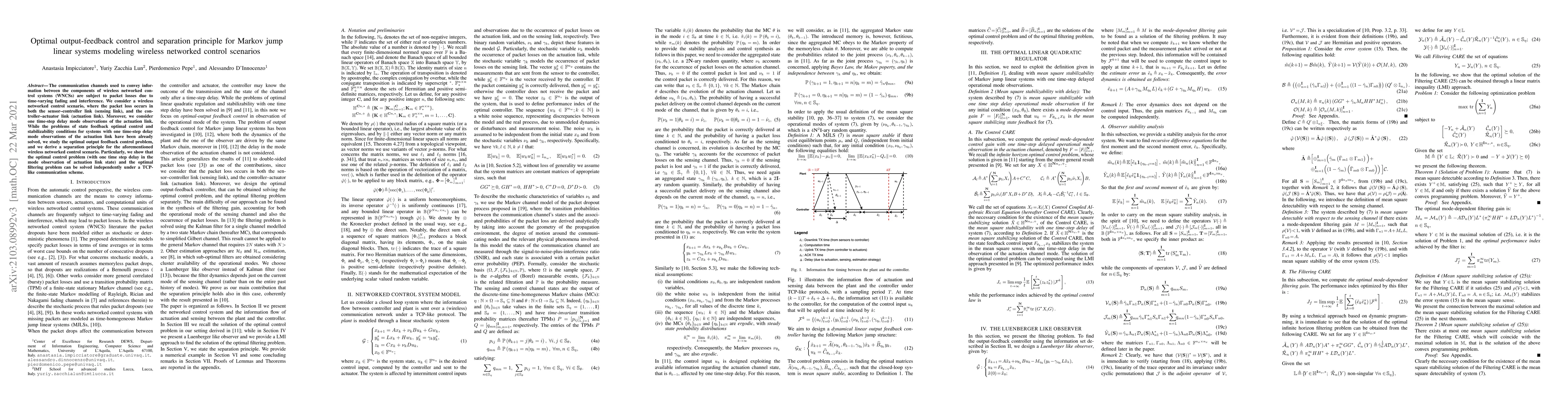This paper addresses optimal output-feedback control for Markov jump linear systems in wireless networked control scenarios, focusing on packet losses and time-step delay in communication links. It derives a separation principle showing that optimal control and filtering problems can be solved independently under a TCP-like communication scheme.