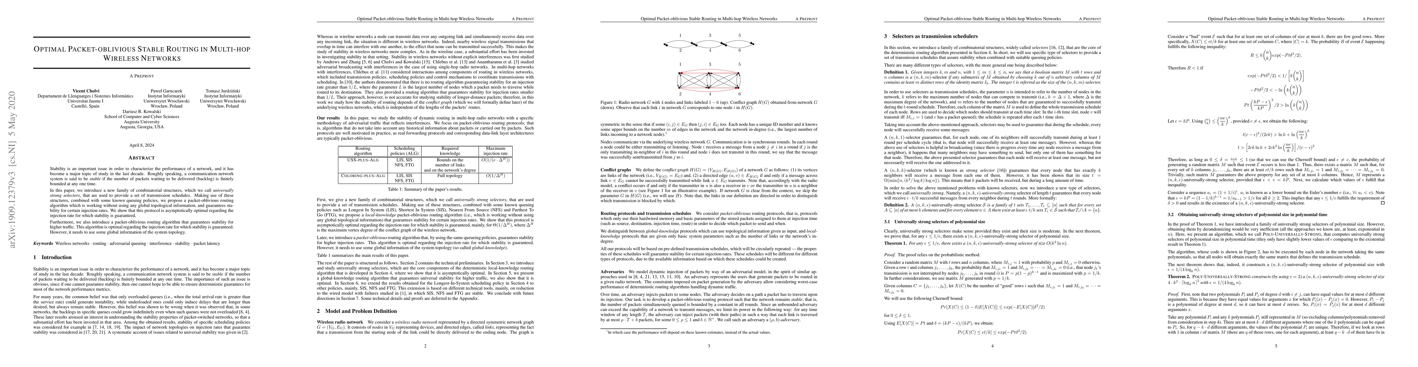 Stability is an important issue in order to characterize the performance of a network, and it has become a major topic of study in the last decade. Roughly speaking, a communication network system is said to be stable if the number of packets waiting to be delivered (backlog) is finitely bounded at any one time. In this paper, we introduce a new family of combinatorial structures, which we call universally strong selectors, that are used to provide a set of transmission schedules. Making use of these structures, combined with some known queuing policies, we propose a packet-oblivious routing algorithm which is working without using any global topological information, and guarantees stability for certain injection rates. We show that this protocol is asymptotically optimal regarding the injection rate for which stability is guaranteed. Furthermore, we also introduce a packet-oblivious routing algorithm that guarantees stability for higher traffic. This algorithm is optimal regarding the injection rate for which stability is guaranteed. However, it needs to use some global information of the system topology.
