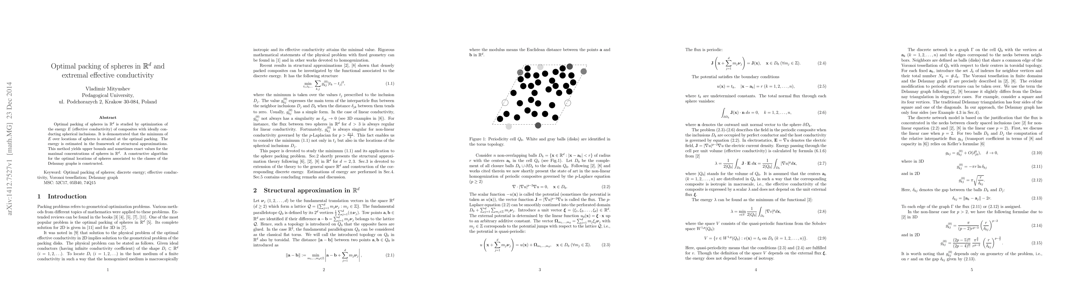 The research uses structural approximation theory to study optimal packing of spheres in $\mathbb R^d$ by optimizing the energy (effective conductivity) of composites with ideally conducting spherical inclusions. It demonstrates that the minimum of energy over sphere locations is attained at the optimal packing, providing upper bounds and sometimes exact values for maximal sphere concentrations.