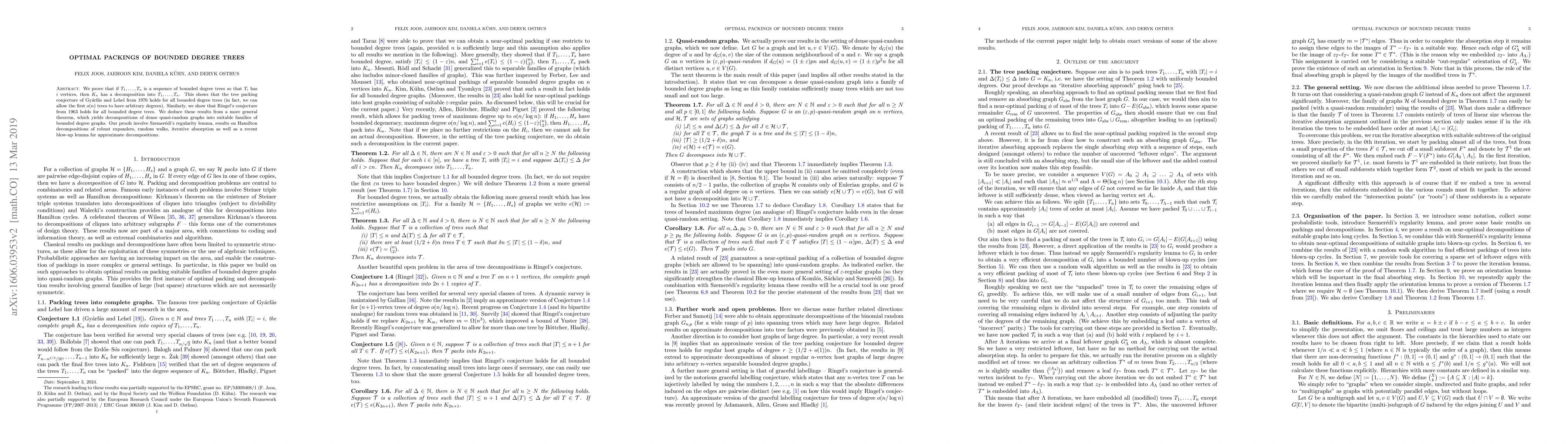 This paper proves the tree packing conjecture for sequences of bounded degree trees, showing that complete graphs can be decomposed into such trees. It also verifies Ringel's conjecture for bounded degree trees, using advanced techniques including Szemerédi's regularity lemma and a blow-up lemma for approximate decompositions.