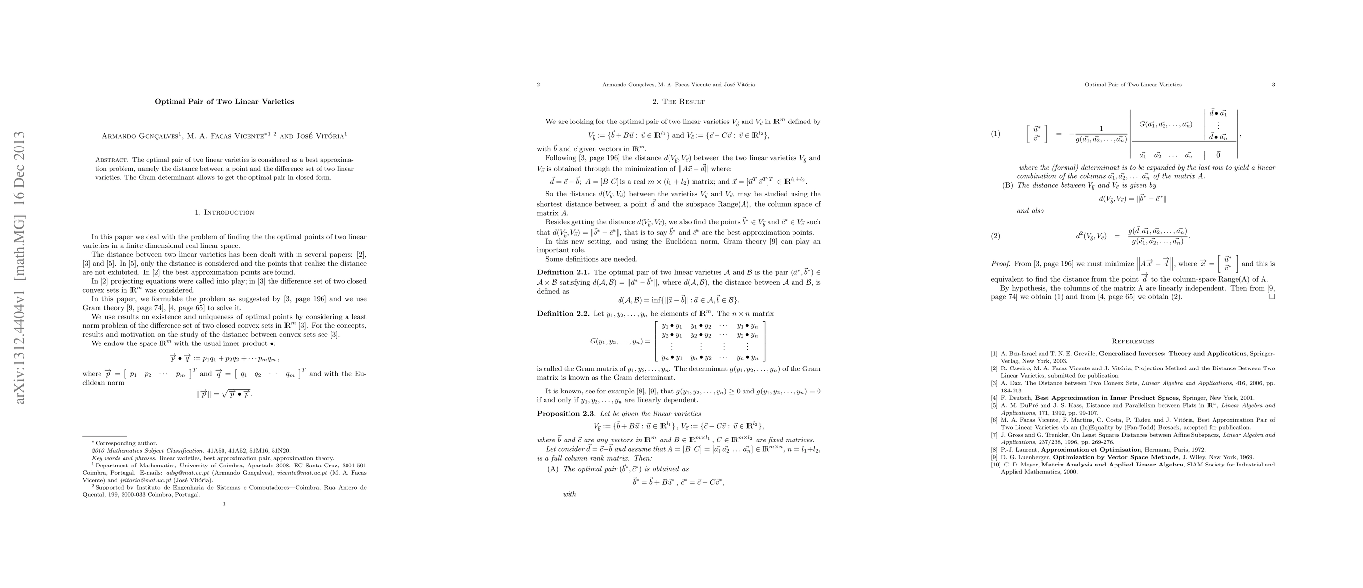 Summary: This paper explores the optimal pair of two linear varieties as a best approximation problem, focusing on the distance between a point and the difference set of these varieties. The Gram determinant is utilized to derive the optimal pair in a closed form.
