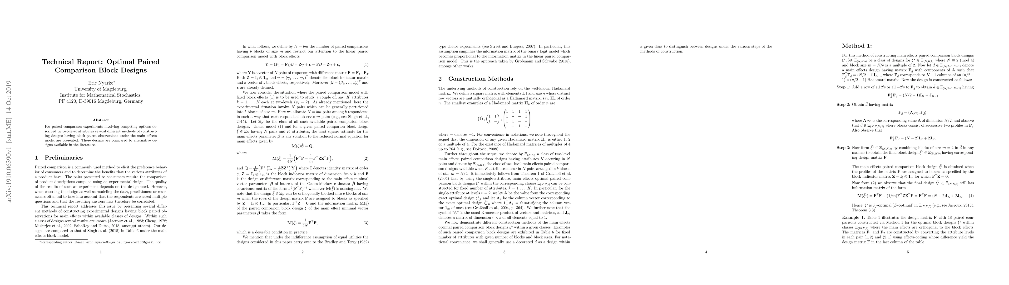 This paper presents various methods for constructing optimal paired comparison block designs under the main effects model for experiments with two-level attributes, and compares these designs to existing alternatives in the literature. The goal is to enhance the efficiency and effectiveness of paired comparison experiments.