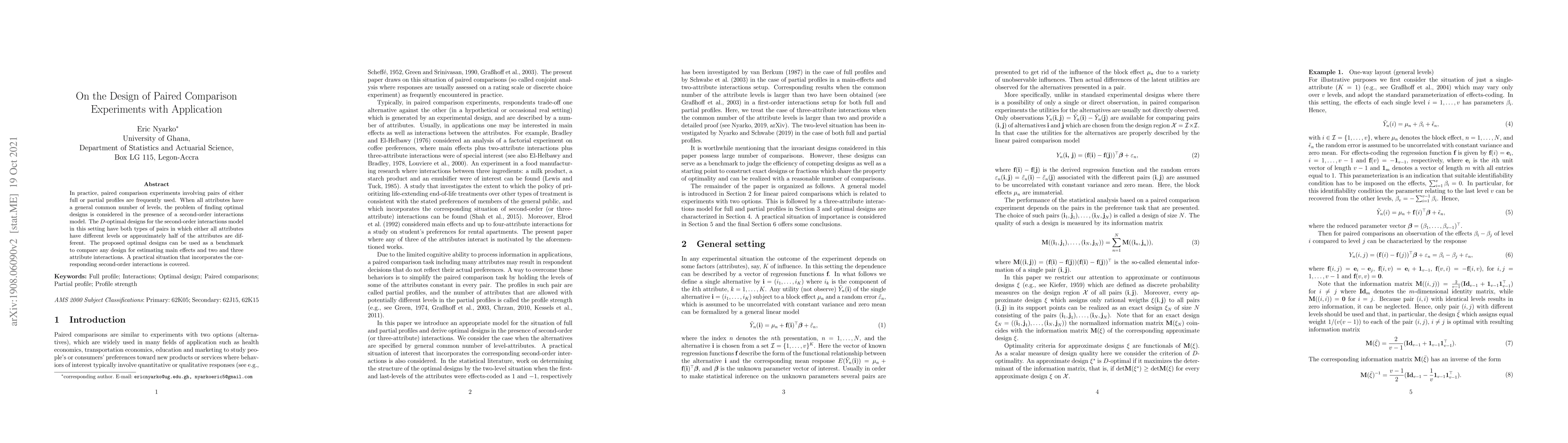 In real life situations often paired comparisons involving alternatives of either full or partial profiles to mitigate cognitive burden are presented. For this situation the problem of finding optimal designs is considered in the presence of second-order interactions when all attributes have general common number of levels.