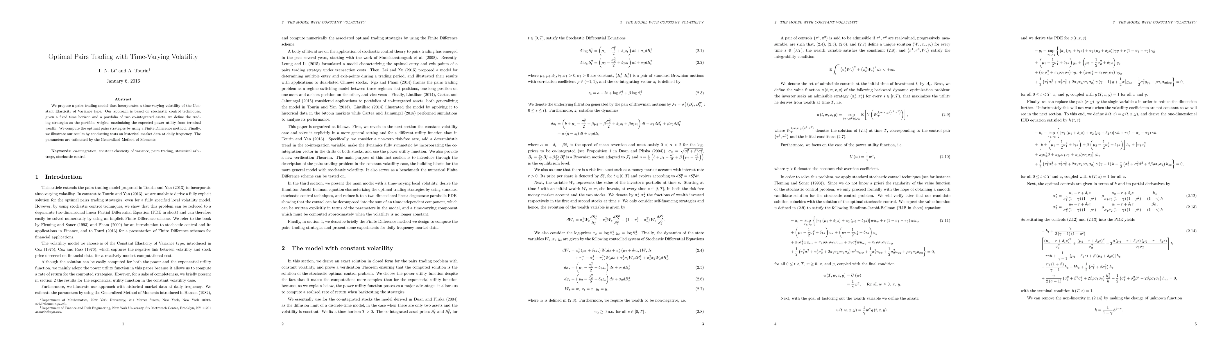 This paper develops a pairs trading model that adapts to time-varying volatility using a Constant Elasticity of Variance approach. It employs stochastic control techniques to determine optimal trading strategies maximizing expected power utility, computed via a Finite Difference method, and tests the model on historical daily market data.