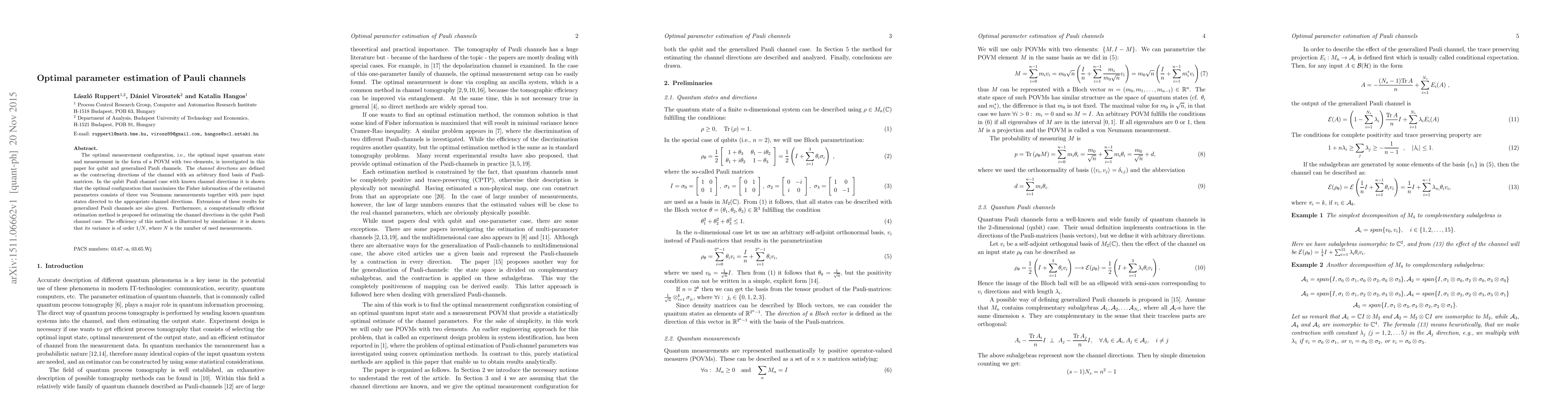 This paper investigates optimal parameter estimation for qubit and generalized Pauli channels, finding that the best configuration maximizes Fisher information using three von Neumann measurements aligned with channel directions. A computationally efficient method for estimating channel directions is proposed, demonstrated to have variance scaling as 1/N with N measurements.