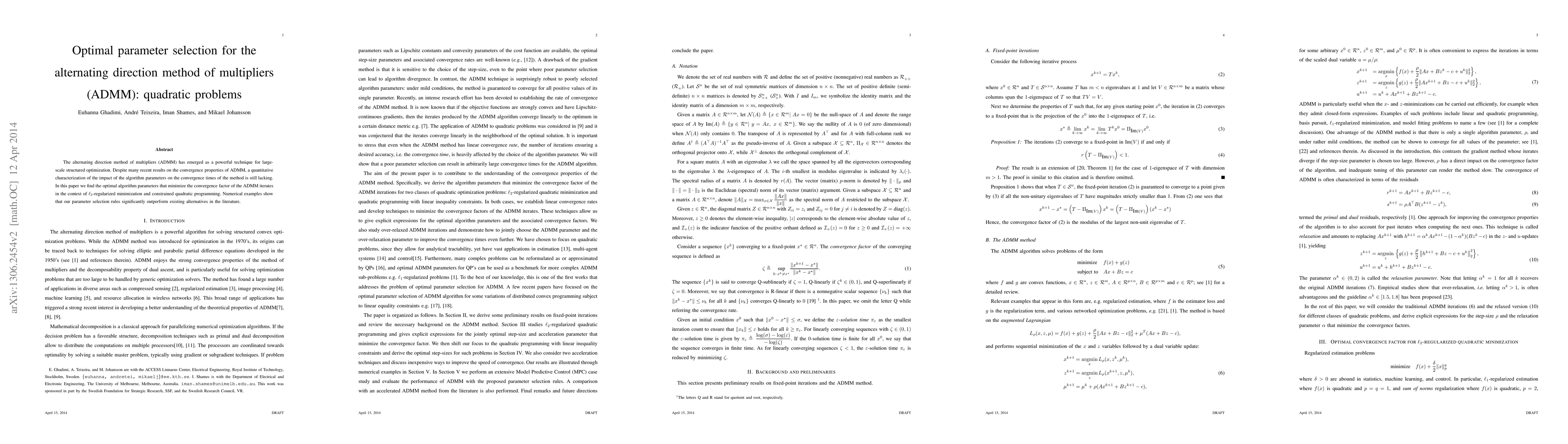 This paper identifies optimal parameters for the alternating direction method of multipliers (ADMM) to minimize convergence times in quadratic problems, providing a quantitative characterization of parameter impact. Numerical results demonstrate that the proposed parameter selection rules outperform existing methods.