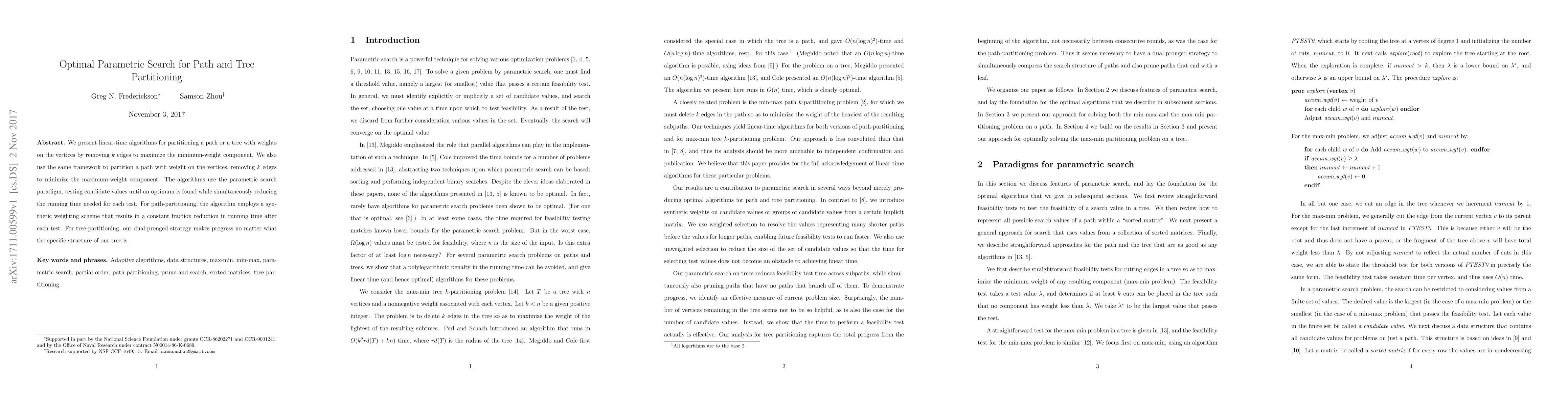 This paper introduces linear-time algorithms for partitioning weighted paths and trees by removing $k$ edges to either maximize or minimize component weights using parametric search. The approach employs a synthetic weighting scheme for paths and a dual-pronged strategy for trees, achieving significant reductions in running time.