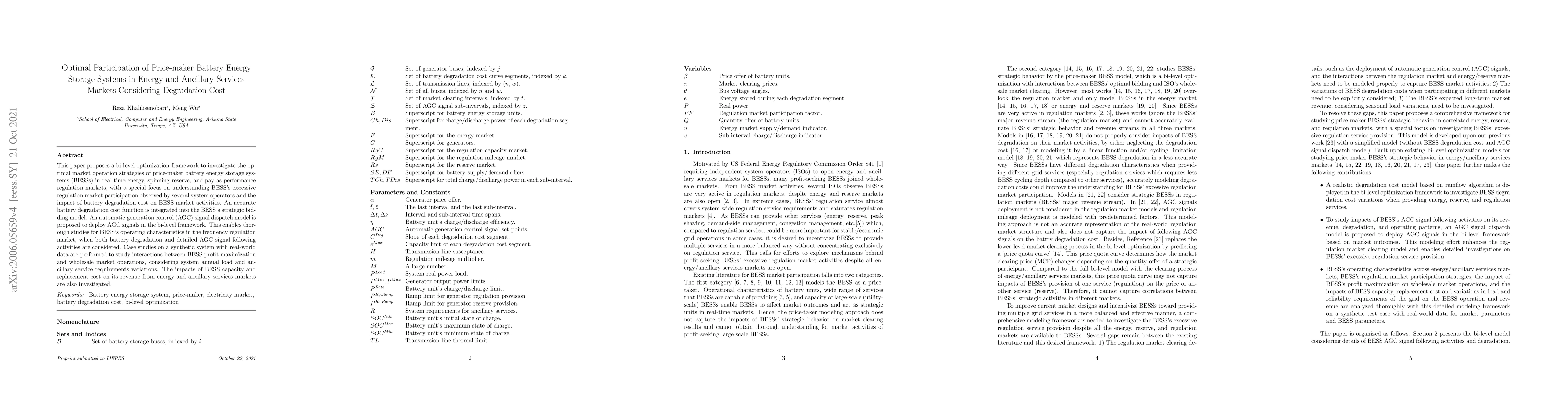 This paper proposes a bi-level optimization framework to investigate the optimal market operation strategies of price-maker battery energy storage systems (BESSs) in real-time energy, spinning reserve, and pay as performance regulation markets, with a special focus on understanding BESS's excessive regulation market participation observed by several system operators and the impact of battery degradation cost on BESS market activities. An accurate battery degradation cost function is integrated into the BESS's strategic bidding model. An automatic generation control (AGC) signal dispatch model is proposed to deploy AGC signals in the bi-level framework. This enables thorough studies for BESS's operating characteristics in the frequency regulation market, when both battery degradation and detailed AGC signal following activities are considered. Case studies on a synthetic system with real-world data are performed to study interactions between BESS profit maximization and wholesale market operations, considering system annual load and ancillary service requirements variations. The impacts of BESS capacity and replacement cost on its revenue from energy and ancillary services markets are also investigated.