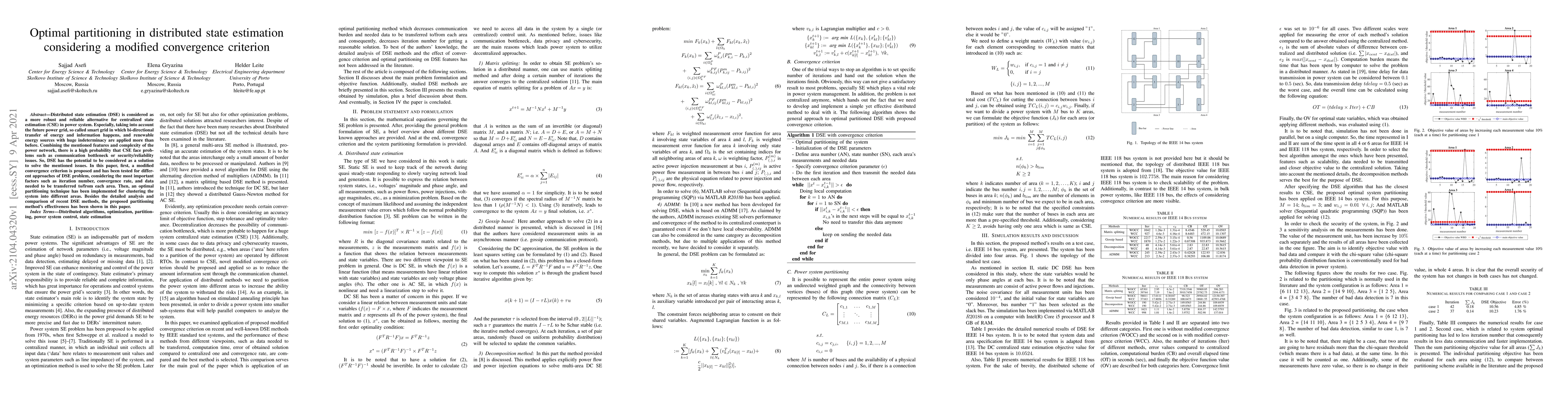 Distributed state estimation (DSE) is considered as a more robust and reliable alternative for centralized state estimation (CSE) in power system. Especially, taking into account the future power grid, so called smart grid in which bi-directional transfer of energy and information happens, and renewable energy sources with huge indeterminacy are applied more than before. Combining the mentioned features and complexity of the power network, there is a high probability that CSE face problems such as communication bottleneck or security/reliability issues. So, DSE has the potential to be considered as a solution to solve the mentioned issues. In this paper, first, a modified convergence criterion is proposed and has been tested for different approaches of DSE problem, considering the most important factors such as iteration number, convergence rate, and data needed to be transferred to/from each area. Then, an optimal partitioning technique has been implemented for clustering the system into different areas. Besides the detailed analysis and comparison of recent DSE methods, the proposed partitioning method's effectiveness has been shown in this paper.