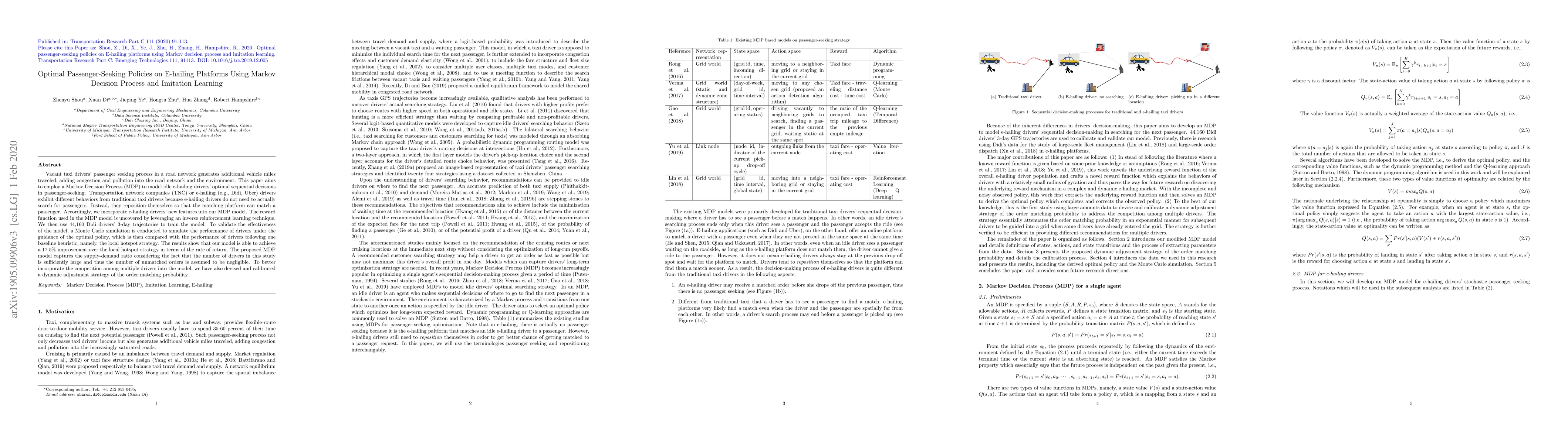 This paper develops an optimal Markov Decision Process (MDP) model to improve e-hailing drivers' passenger-seeking strategies, incorporating unique e-hailing behaviors. The model's reward function is derived using inverse reinforcement learning, validated through simulation, and shows a 17.5% improvement over a local hotspot strategy in terms of return rate.