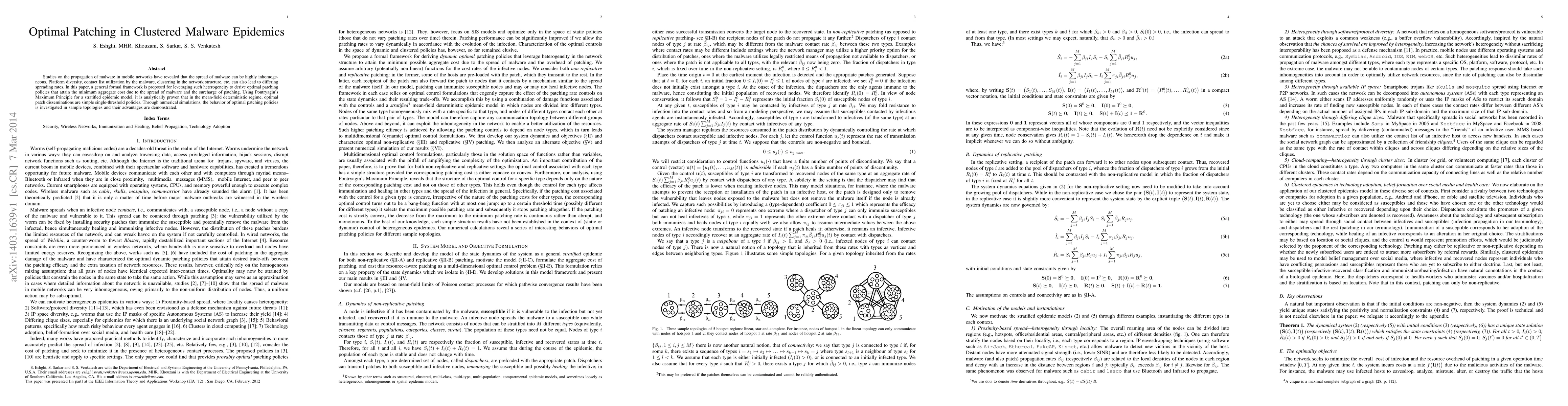This paper proposes a formal framework to derive optimal patching policies for clustered malware epidemics in mobile networks, leveraging network heterogeneity. Using Pontryagin's Maximum Principle, it analytically proves that optimal patch disseminations follow simple single-threshold policies, which are validated through numerical simulations in various network topologies.