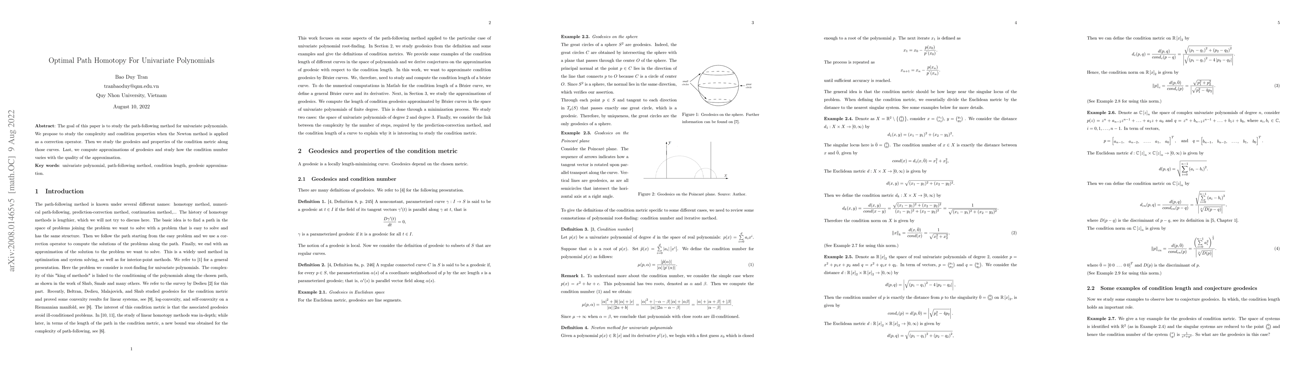 The goal of this paper is to study the path-following method for univariate polynomials. We propose to study the complexity and condition properties when the Newton method is applied as a correction operator. Then we study the geodesics and properties of the condition metric along those curves. Last, we compute approximations of geodesics and study how the condition number varies with the quality of the approximation.