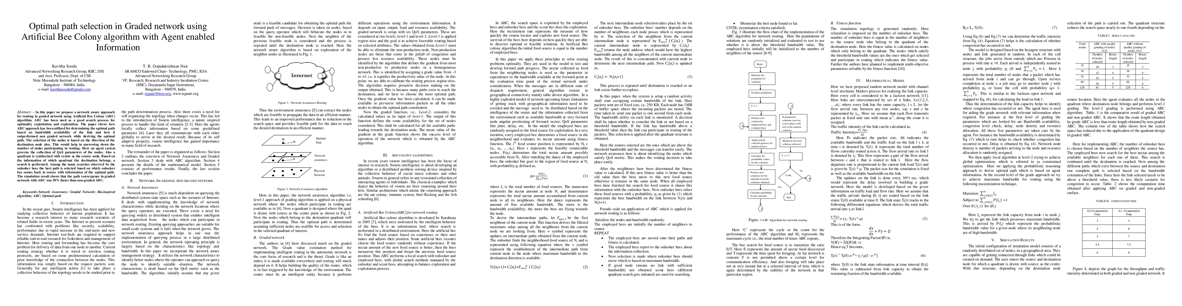 This paper proposes an optimal path selection method in graded networks using the Artificial Bee Colony (ABC) algorithm, enhanced by an agent system for QoS parameter collection. The ABC algorithm efficiently determines optimal paths based on link bandwidth and destination direction, achieving 30% faster path convergence compared to non-graded networks.