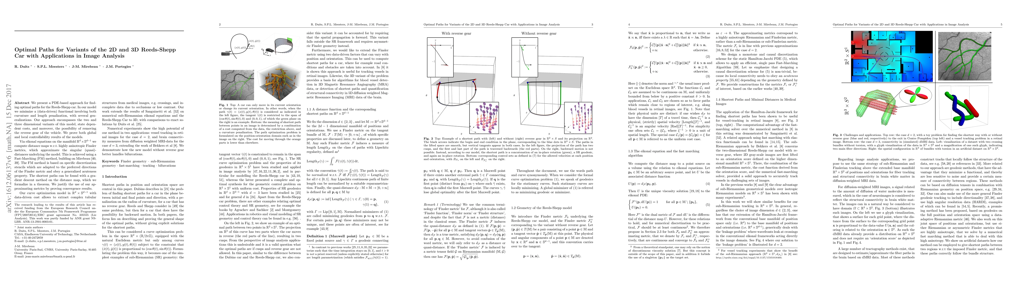 Researchers developed a new method to optimize paths for the Reeds-Shepp car in 2D and 3D, with applications in image analysis, using a PDE-based approach that minimizes curvature and length penalties.