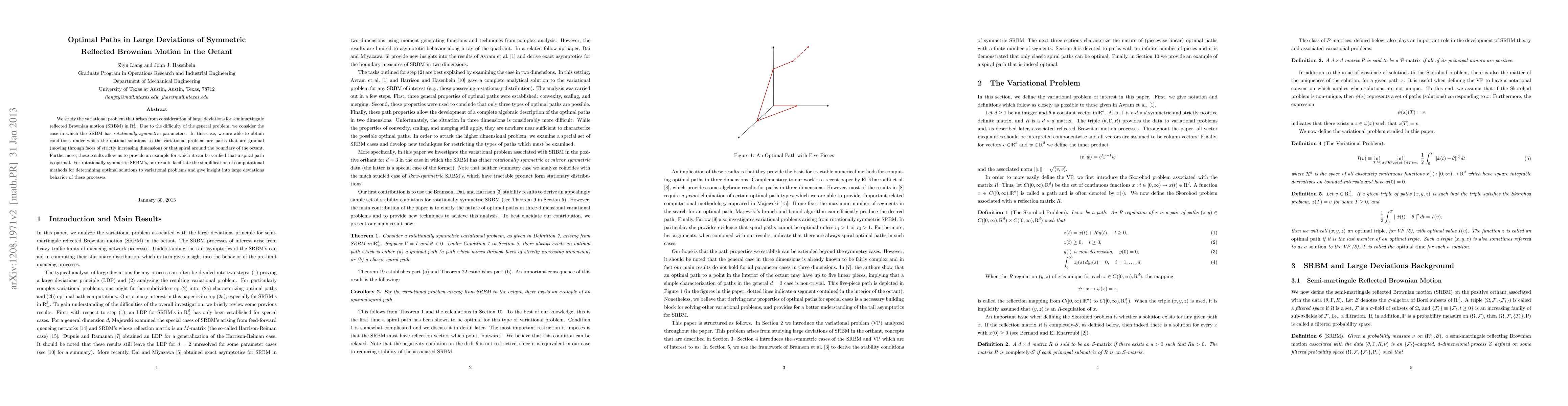 We study the variational problem that arises from consideration of large deviations for semimartingale reflected Brownian motion (SRBM) in the positive octant. Due to the difficulty of the general problem, we consider the case in which the SRBM has rotationally symmetric parameters. In this case, we are able to obtain conditions under which the optimal solutions to the variational problem are paths that are gradual (moving through faces of strictly increasing dimension) or that spiral around the boundary of the octant. Furthermore, these results allow us to provide an example for which it can be verified that a spiral path is optimal. For rotationally symmetric SRBM's, our results facilitate the simplification of computational methods for determining optimal solutions to variational problems and give insight into large deviations behavior of these processes.