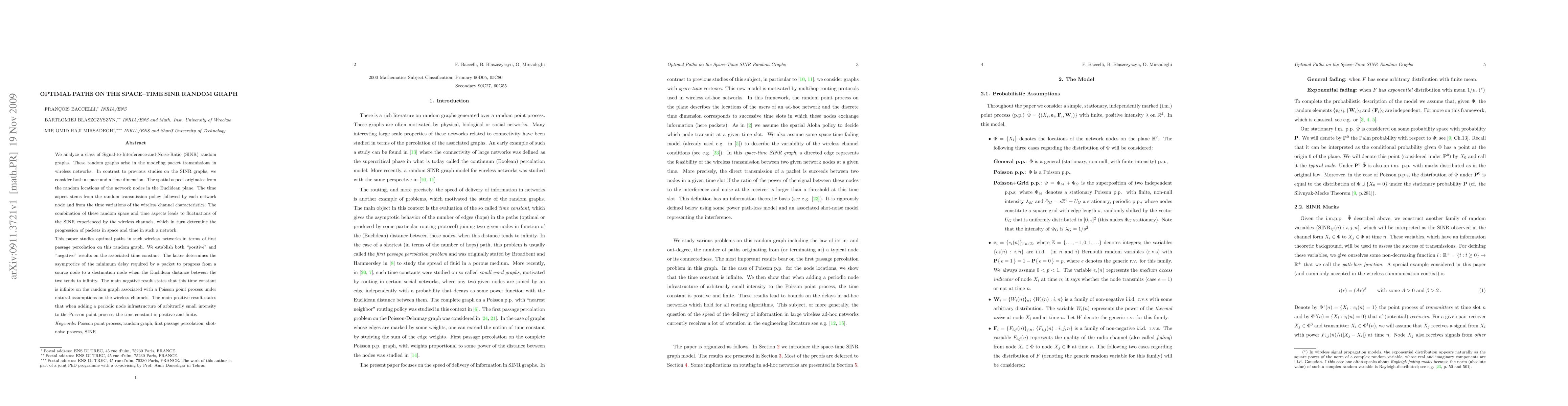 We analyze a class of Signal-to-Interference-and-Noise-Ratio (SINR) random graphs. These random graphs arise in the modeling packet transmissions in wireless networks. In contrast to previous studies on the SINR graphs, we consider both a space and a time dimension. The spatial aspect originates from the random locations of the network nodes in the Euclidean plane. The time aspect stems from the random transmission policy followed by each network node and from the time variations of the wireless channel characteristics. The combination of these random space and time aspects leads to fluctuations of the SINR experienced by the wireless channels, which in turn determine the progression of packets in space and time in such a network. This paper studies optimal paths in such wireless networks in terms of first passage percolation on this random graph. We establish both "positive" and "negative" results on the associated time constant. The latter determines the asymptotics of the minimum delay required by a packet to progress from a source node to a destination node when the Euclidean distance between the two tends to infinity. The main negative result states that this time constant is infinite on the random graph associated with a Poisson point process under natural assumptions on the wireless channels. The main positive result states that when adding a periodic node infrastructure of arbitrarily small intensity to the Poisson point process, the time constant is positive and finite.
