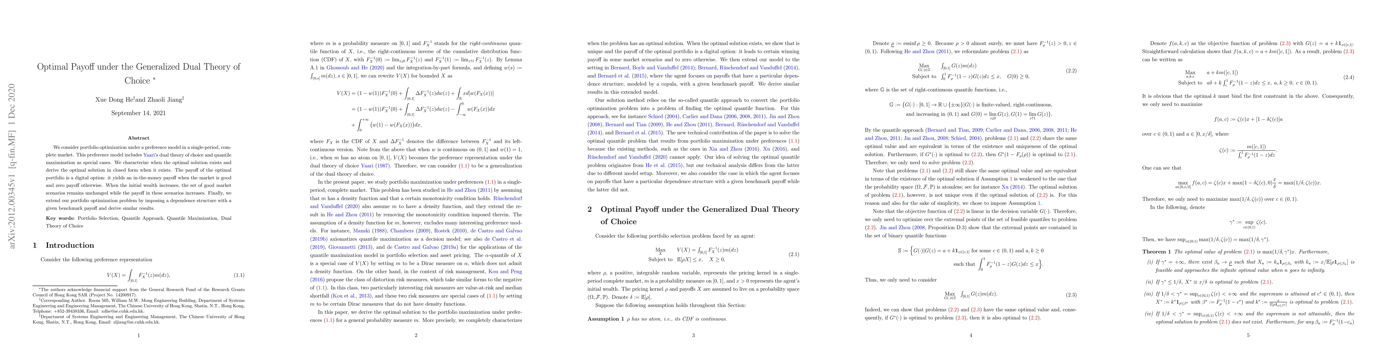 We consider portfolio optimization under a preference model in a single-period, complete market. This preference model includes Yaari's dual theory of choice and quantile maximization as special cases. We characterize when the optimal solution exists and derive the optimal solution in closed form when it exists. The payoff of the optimal portfolio is a digital option: it yields an in-the-money payoff when the market is good and zero payoff otherwise. When the initial wealth increases, the set of good market scenarios remains unchanged while the payoff in these scenarios increases. Finally, we extend our portfolio optimization problem by imposing a dependence structure with a given benchmark payoff and derive similar results.