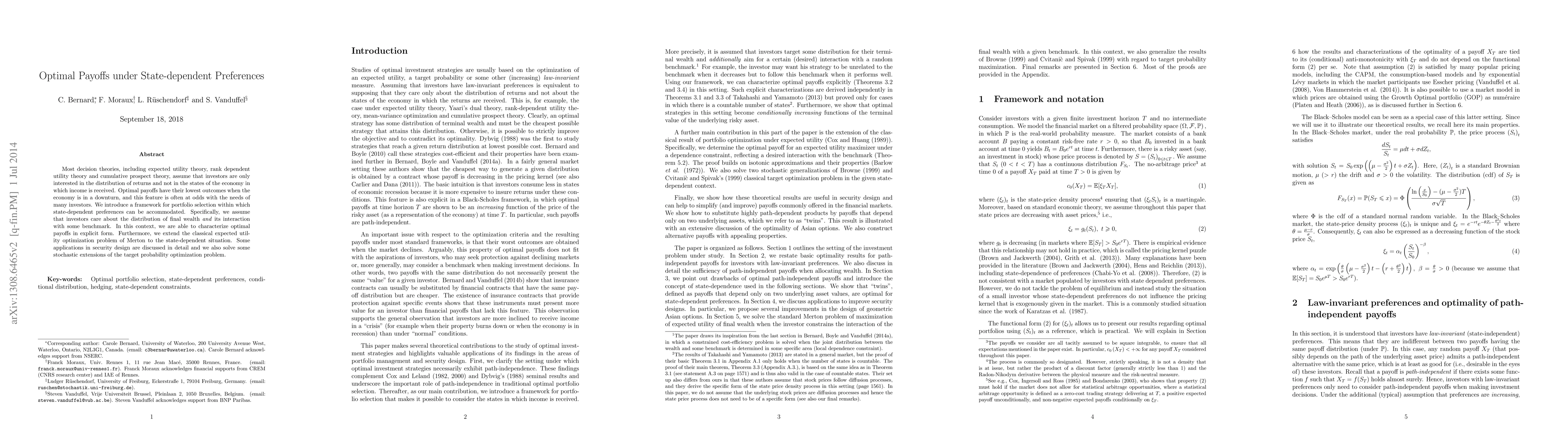Most decision theories, including expected utility theory, rank dependent utility theory and cumulative prospect theory, assume that investors are only interested in the distribution of returns and not in the states of the economy in which income is received. Optimal payoffs have their lowest outcomes when the economy is in a downturn, and this feature is often at odds with the needs of many investors. We introduce a framework for portfolio selection within which state-dependent preferences can be accommodated. Specifically, we assume that investors care about the distribution of final wealth and its interaction with some benchmark. In this context, we are able to characterize optimal payoffs in explicit form. Furthermore, we extend the classical expected utility optimization problem of Merton to the state-dependent situation. Some applications in security design are discussed in detail and we also solve some stochastic extensions of the target probability optimization problem.